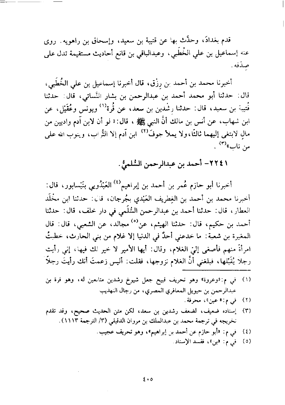 2241 - أَحْمَد بْن عَبْد الرَّحْمَن السلمي أَخْبَرَنَا أَبُو حازم عُمَر بْن أَحْمَد بْن إِبْرَاهِيم العبدوي، بنيسابور، قَالَ: أَخْبَرَنَا مُحَمَّد بْن أَحْمَدَ الغطريف العبدي، بجرجان، قَالَ: حَدَّثَنَا ابن مَخْلَد الْعَطَّار، قَالَ: حَدَّثَنَا أَحْمَد بْن عَبْد الرَّحْمَن السلمي فِي دار خلف، قَالَ: حَدَّثَنَا أَحْمَد بْن حَكِيم، قَالَ: حَدَّثَنَا الهيثم، عَنْ مجالد، عَنِ الشعبي، قَالَ: قال المغيرة بْن شعبة: ما خدعني أحد فِي الدنيا إلا غلام من بني الحارث، خطبت امرأة منهم فأصغى إلي الغلام، وَقَالَ: أيها الأمير، لا خير لك فيها إني رأيت رجلا يقبلها، فبلغني أن الغلام تزوجها، فقلت: أليس زعمت أنك رأيت رجلا يقبلها، قَالَ: ما كذبت أيها الأمير، رأيت أباها يقبلها! فكلما ذكرت قوله علمت أنه خدعني.