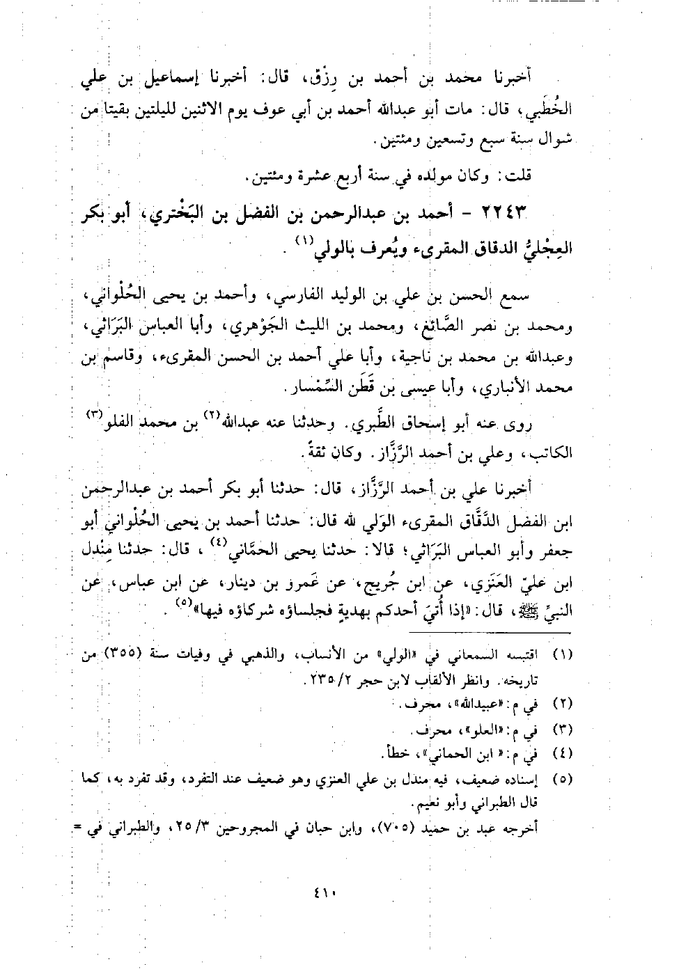 2243 - أَحْمَد بْن عَبْد الرَّحْمَن بْن الْفَضْل بْن البخترى أَبُو بَكْر العجلي الدَّقَّاق الْمُقْرِئ ويعرف بالولي