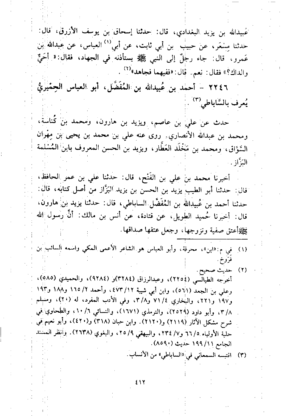 2246 - أَحْمَد بْن عُبَيْد اللَّهِ بْن المفضل أَبُو الْعَبَّاس الحميري يعرف بالساباطي حدث عَنْ: عَلِيّ بْن عَاصِم، ويزيد بْن هارون، ومحمد بْن كناسة، ومحمد بْن عَبْد اللَّه الأَنْصَارِيّ.
