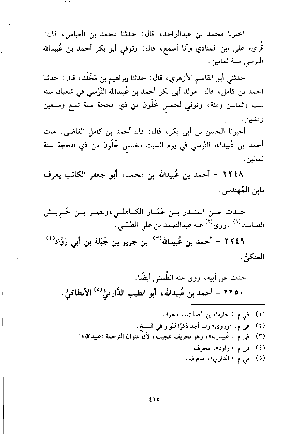 2248 - أَحْمَد بْن عُبَيْد اللَّهِ بْن مُحَمَّد أَبُو جعفر الكاتب يعرف بابن المهندس حدث عَنْ: المنذر بْن عمار الكاهلي، ونصر بْن حَرِيش الصامت.