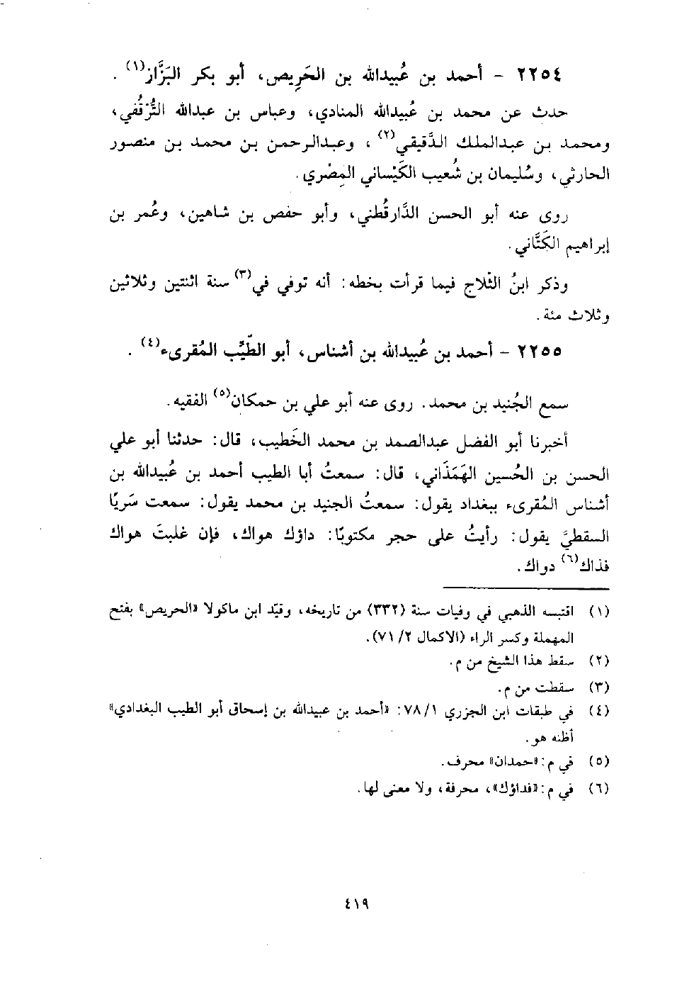 2254 - أَحْمَد بْن عُبَيْد اللَّهِ بْن الحربص أَبُو بَكْر البزاز حدث عَنْ: مُحَمَّد بْن عُبَيْد اللَّهِ المنادي، وعباس بْن عَبْد اللَّه الترقفي، ومحمد بن عبد الملك الدقيقي، وعبد الرَّحْمَن بْن مُحَمَّد بْن مَنْصُور الحارثي، وسليمان بْن شُعَيْب الكيساني المصري.