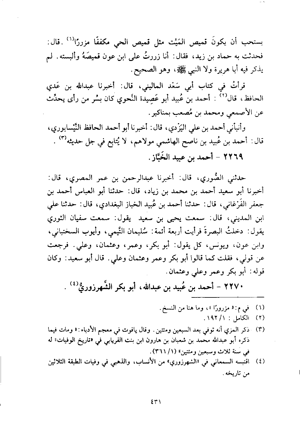 2270 - أَحْمَد بْن عُبَيْد اللَّهِ بْن عَبْد اللَّه أَبُو بَكْر الشهرزوري سكن بغداد، وَحَدَّثَ بها عَنْ مُحَمَّد بْن بكار بْن الريان، وداود بْن رشيد، وأبي همام السكوني.