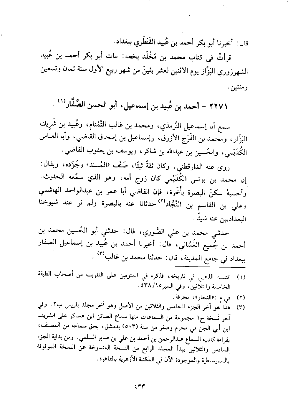 2271 - أَحْمَد بْن عبيد بْن إِسْمَاعِيل أَبُو الْحَسَن الصفار سمع أَبَا إِسْمَاعِيل الترمذي، ومحمد بْن غالب التمتام، وعبيد بْن شريك البزَّار، ومحمد بْن الفرج الأزرق، وإسماعيل بْن إِسْحَاق الْقَاضِي، وَأَبَا الْعَبَّاس الكديمي، وَالْحُسَيْن بْن عَبْد اللَّه بْن شاكر، ويوسف بْن يَعْقُوب الْقَاضِي.