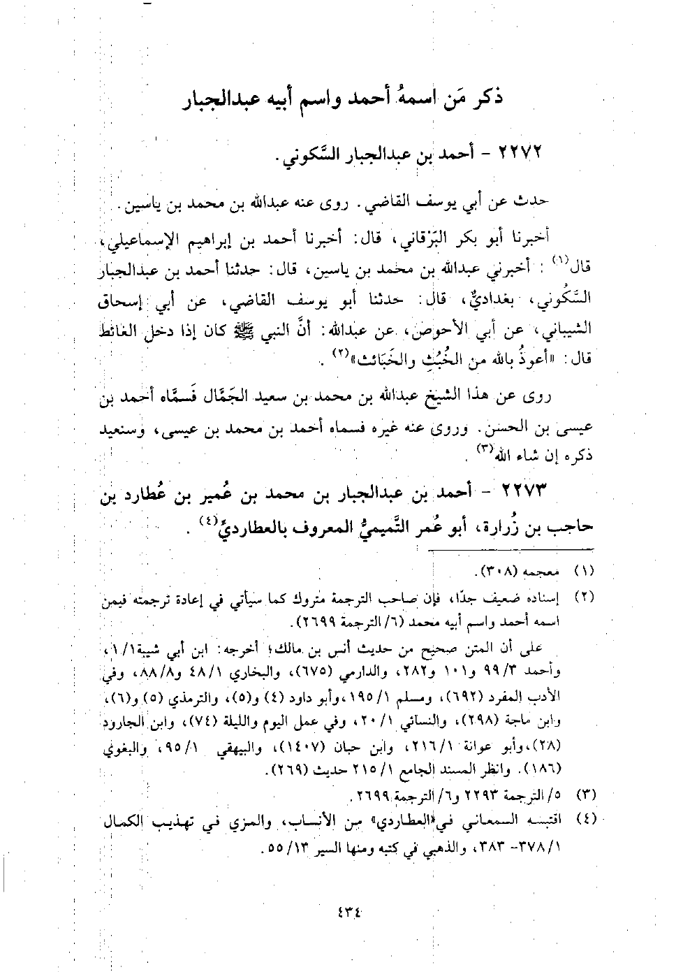 2273 - أَحْمَد بْن عَبْد الجبار بْن مُحَمَّد بْن عمير بْن عطارد بْن حاجب بْن زرارة أَبُو عُمَر التميمي الْمَعْرُوف بالعطاردي من أهل الكوفة، قدم بغداد وَحَدَّثَ بها عَنْ عَبْد اللَّه بْن إِدْرِيس الأودي، وأبي بَكْر بْن عياش، وحفص بْن غياث، ومحمد بْن فضيل، ووكيع، وأبي معاوية، وَكَانَ عنده عَنْ أَبِي معاوية " تفسيره "، وعن يونس بْن بكير " مغازي " مُحَمَّد بْن إِسْحَاق.