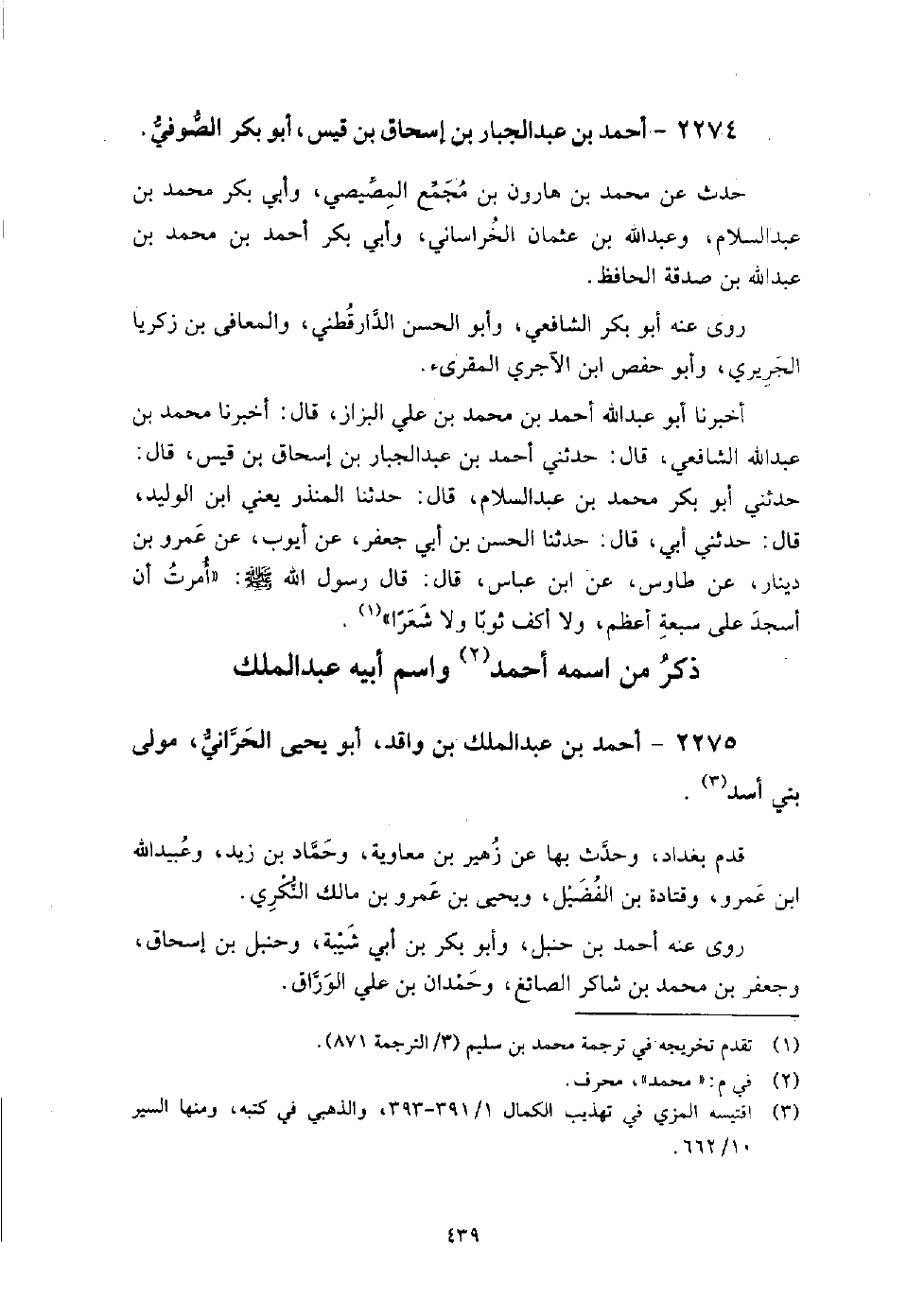 2274 - أَحْمَد بْن عَبْد الجبار بْن إِسْحَاق بْن قَيْس أَبُو بَكْر الصوفي حدث عَنْ: مُحَمَّد بْن هارون بْن مجمع المصيصي، وأبي بَكْر مُحَمَّد بْن عَبْد السلام، وَعَبْد اللَّهِ بْن عُثْمَان الخراساني، وأبي بَكْر أَحْمَد بْن مُحَمَّد بْن عَبْد اللَّه بْن صدقة الْحَافِظُ.