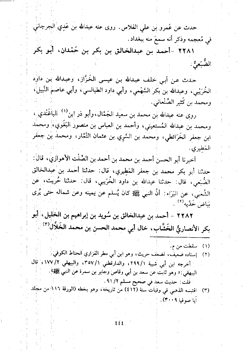 2281 - أَحْمَد بْن عَبْد الخالق بْن بَكْر بْن حمدان أَبُو بَكْر الضبعي حدث عَنْ: أَبِي خلف عَبْد اللَّه بْن عِيسَى الخزاز، وَعَبْد اللَّهِ بْن دَاوُد الخريبي، وَعَبْد اللَّهِ بْن بَكْر السهمي، وأبي دَاوُد الطيالسي، وأبي عَاصِم النبيل، ومحمد بْن كثير الصنعاني.