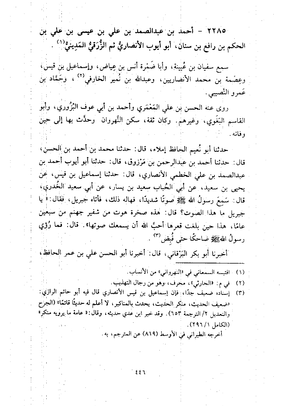 2285 - أَحْمَد بْن عَبْد الصمد بْن عَلِيّ بْن عِيسَى بْن عَلِيّ بْن الحكم بْن رافع بْن سنان أَبُو أَيُّوب الأَنْصَارِيّ ثم الزُّرَقيُّ المَدِينيُّ سمع سُفْيَان بْن عُيَيْنَةَ، وَأَبَا ضمرة أنس بْن عياض، وإسماعيل بْن قَيْس، وعصمة بْن مُحَمَّد الأنصاريين، وَعَبْد اللَّهِ بْن نمير الخارفي، وحماد بْن عمرو النَّصِيبِيّ.