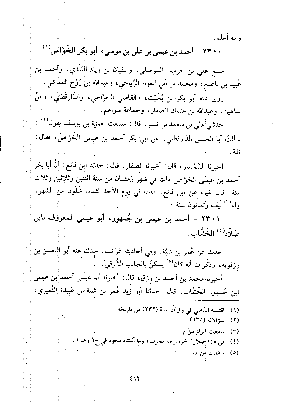 2300 - أَحْمَد بْن عِيسَى بْن عَلِيّ بْن مُوسَى أَبُو بَكْر الخواص سمع على بْن حرب الموصلي، وسفيان بْن زياد البلدي، وأحمد بْن عبيد بْن ناصح، ومحمد بْن أَبِي العوام الرياحي، وَعَبْد اللَّهِ بْن روح المدائني.