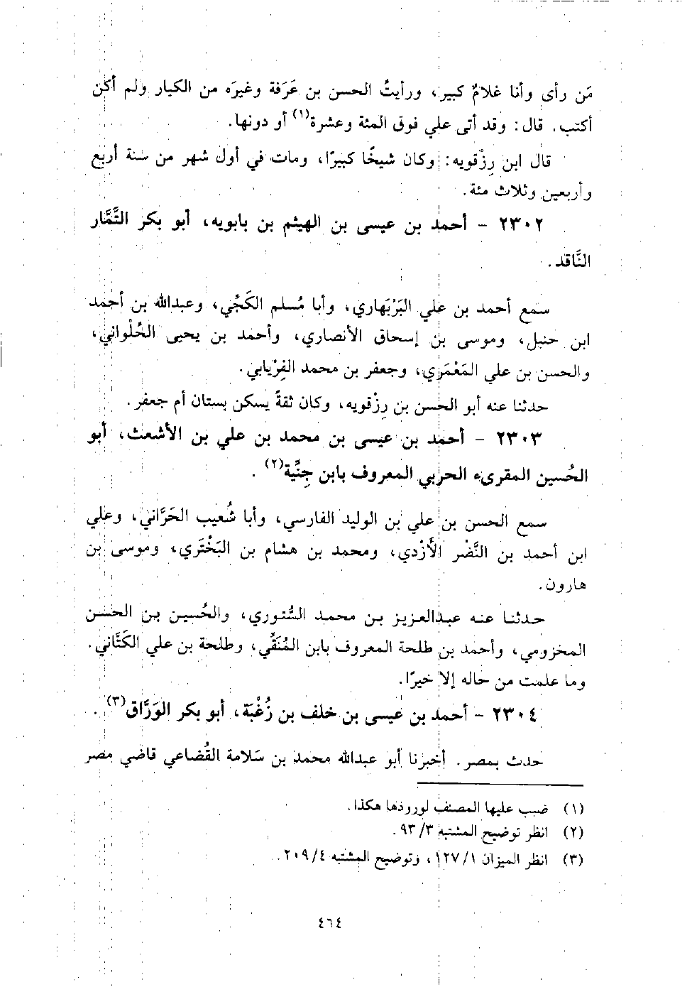 2302 - أَحْمَد بْن عِيسَى بْن الهيثم بْن بأبويه أَبُو بَكْر التمار الناقد سمع أَحْمَد بْن عَلِيّ البربهاري، وَأَبَا مُسْلِم الكجي، وَعَبْد اللَّهِ بْن أَحْمَدَ بْن حنبل، وموسى بْن إِسْحَاق الأَنْصَارِيّ، وأحمد بْن يَحْيَى الحلواني، والحسن بْن عَلِيّ المعمري، وجعفر بْن مُحَمَّد الفريابي.
