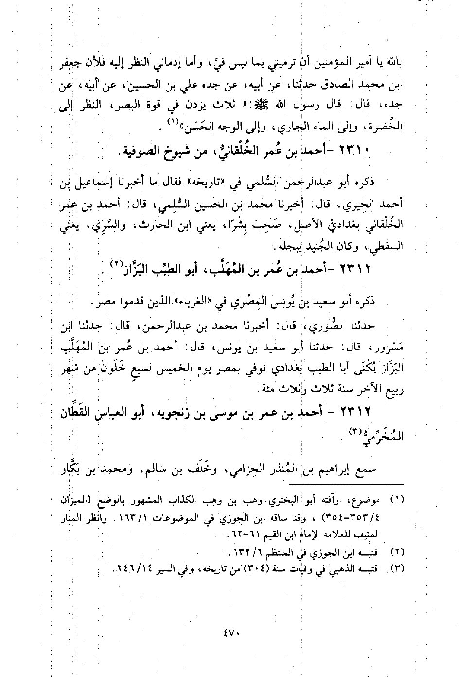 2310 - أَحْمَد بْن عُمَر الخلقاني من شيوخ الصوفية ذكره أَبُو عَبْد الرَّحْمَن السلمي فِي تاريخه، فَقَالَ: ما أَخْبَرَنَا إِسْمَاعِيل بْن أَحْمَدَ الحيري، قَالَ: أَخْبَرَنَا مُحَمَّد بْن الْحُسَيْن السلمي، قَالَ: أَحْمَد بْن عُمَر الخلقاني بغدادي الأصل، صحب بشرا، يَعْنِي ابْن الحارث، والسرى يَعْنِي السقطي، وَكَانَ الجنيد يبجله.