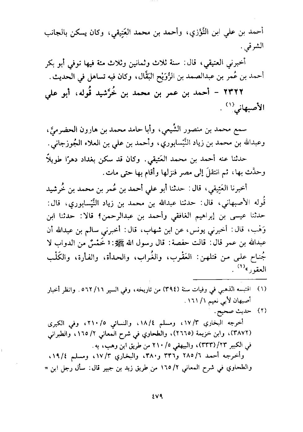 (1526) -[5: 479] أَخْبَرَنَا الْعَتِيقِيُّ، قَالَ: حَدَّثَنَا أَبُو عَلِيٍّ أَحْمَدُ بْنُ عُمَرَ بْنِ مُحَمَّدِ بْنِ خُرْشِيدٍ قَوْلَهُ الأَصْبَهَانِيُّ، قَالَ: حَدَّثَنَا عَبْدُ اللَّهِ بْنُ مُحَمَّدِ بْنِ زِيَادٍ النَّيْسَابُورِيُّ، قَالَ: حَدَّثَنَا عِيسَى بْنُ إِبْرَاهِيمَ الْغَافِقِيُّ وَأَحْمَدُ بْنُ عَبْدِ الرَّحْمَنِ، قَالا: حَدَّثَنَا ابْنُ وَهْبٍ، قَالَ: أَخْبَرَنِي يُونُسُ، عَنِ ابْنِ شِهَابٍ، قَالَ: أَخْبَرَنِي سَالِمُ بْنُ عَبْدِ اللَّهِ، أَنَّ عَبْدَ اللَّهِ بْنَ عُمَرٍ، قَالَ: قَالَتْ حَفْصَةُ: قَالَ رَسُولُ اللَّهِ صَلَّى اللَّهُ عَلَيْهِ وَسَلَّمَ: " خَمْسٌ مِنَ الدَّوَابِّ لا جَنَاحَ عَلَى مَنْ قَتَلَهُنَّ: الْعَقْرَبُ، وَالْغُرَابُ، وَالْحِدْأَةُ، وَالْفَأْرَةُ، وَالْكَلْبُ الْعَقُورُ " قَالَ لي العتيقي: سَمِعْتُ منه بِبَغْدَادَ فِي سنة اثنتين وثلاث مائة، ثم سَمِعْتُ منه بعد ذلك بمكة وبمصر، وَكَانَ يحضر فِي كل سنة مكة فِي موسم الحج إِلَى أن توفي بمصر فِي سنة أربع وتسعين وثلاث مائة، وَكَانَ ثِقَةً حسن الأصول.