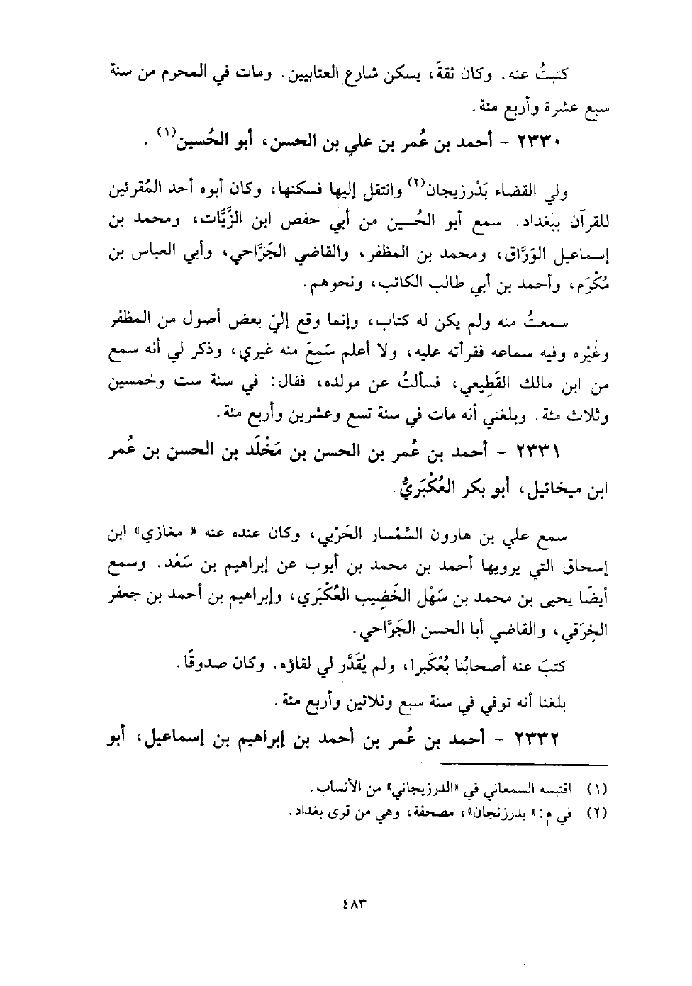 2330 - أَحْمَد بْن عُمَر بْن عَلِيّ بْن الْحَسَن أَبُو الْحُسَيْن ولي القضاء بدرزنجان وانتقل إليها فسكنها، وَكَانَ أبوه أحد المقرئين للقران بِبَغْدَادَ، سمع أَبُو الْحُسَين من أَبِي حَفْص ابْن الزيات، ومحمد بْن إِسْمَاعِيل الوراق، ومحمد بْن المظفر، والقاضي الجراحي، وأبي الْعَبَّاس بْن مكرم، وأحمد بْن أَبِي طالب الكاتب، ونحوهم.