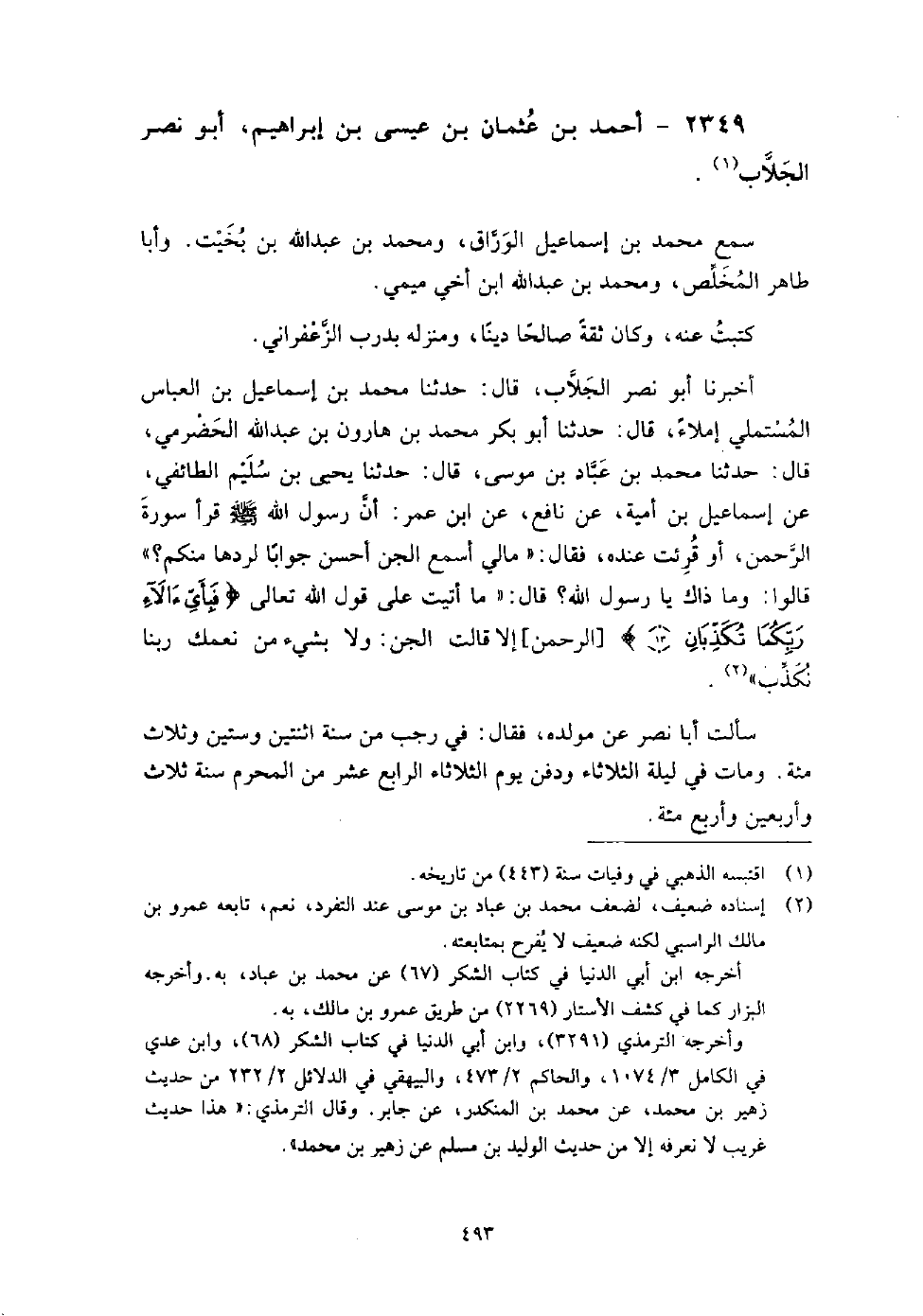 (1531) -[5: 493] أَخْبَرَنَا أَبُو نَصْرٍ الْجَلابُ، قَالَ: حَدَّثَنَا مُحَمَّدُ بْنُ إِسْمَاعِيلَ بْنِ الْعَبَّاسِ الْمُسْتَمْلِيُّ إِمْلاءً، قَالَ: حَدَّثَنَا أَبُو بَكْرٍ مُحَمَّدُ بْنُ هَارُونَ بْنِ عَبْدِ اللَّهِ الْحَضْرَمِيُّ، قَالَ: حَدَّثَنَا مُحَمَّدُ بْنُ عَبَّادِ بْنِ مُوسَى، قَالَ: حَدَّثَنَا يَحْيَى بْنُ سُلَيْمٍ الطَّائِفِيُّ، عَنْ إِسْمَاعِيلَ بْنِ أُمَيَّةَ، عَنْ نَافِعٍ، عَنِ ابْنِ عُمَرَ، أَنَّ رَسُولَ اللَّهِ صَلَّى اللَّهُ عَلَيْهِ وَسَلَّمَ قَرَأَ سُورَةَ الرَّحْمَنِ، أَوْ قُرِئَتْ عِنْدَهُ، فَقَالَ: " مَا لِي أَسْمَعُ الْجِنَّ أَحْسَنَ جَوَابًا لِرَدِّهَا مِنْكُمْ "؟ قَالُوا: وَمَا ذَاكَ يَا رَسُولَ اللَّهِ؟ قَالَ: " مَا أَتَيْتُ عَلَى قَوْلِ اللَّهِ تَعَالَى: {فَبِأَيِّ آلاءِ رَبِّكُمَا تُكَذِّبَانِ}، إِلا قَالَتِ الْجِنُّ: وَلا بِشَيْءٍ مِنْ نِعَمِكَ رَبَّنَا نُكَذِّبُ " سألت أَبَا نصر عَنْ مولده، فَقَالَ: فِي رجب من سنة اثنتين وستين وثلاث مائة، ومات فِي ليلة الثلاثاء، ودفن فِي يوم الثلاثاء الرابع عشر من المحرم من سنة ثلاث وأربعين وأربع مائة.
