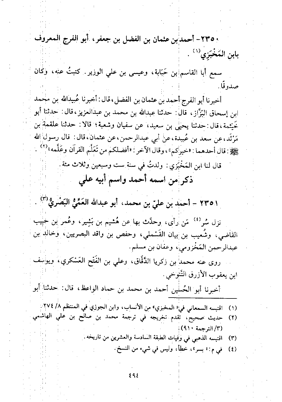 2351 - أَحْمَد بْن عَلِيّ بْن مُحَمَّد أَبُو عَبْد اللَّه العمي البصري نزل سر من رأى، وَحَدَّثَ بها عَنْ هشيم بْن بشير، وعمر بْن حَبِيب الْقَاضِي، وشعيب بْن بيان القسملي، وحفص بْن واقد البصريين، وخالد بْن عَبْد الرَّحْمَن المخزومي، وعفان بْن مُسْلِم.