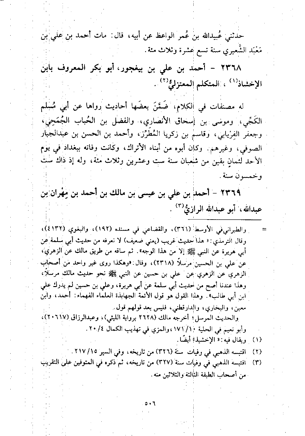 2368 - أَحْمَد بْن عَلِيّ بْن بيغجور أَبُو بَكْر الْمَعْرُوف بابن الإخشاذ المتكلم المعتزلي لَهُ مصنفات فِي الكلام، ضمن بعضها أحاديث رواها عَنْ أَبِي مُسْلِم الكجي، وموسى بْن إِسْحَاق الأَنْصَارِيّ، والفضل بْن الحباب الجمحي، وجعفر الفريابي، وقاسم بْن زكريا المطرز، وأحمد بْن الْحَسَن بْن عَبْد الجبار الصوفي، وغيرهم.