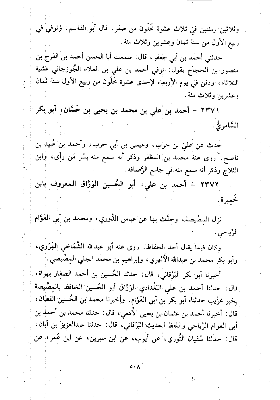 2372 - أَحْمَد بْن عَلِيّ أَبُو الْحُسَيْن الوراق الْمَعْرُوف بابن خميرة نزل المصيصة، وَحَدَّثَ بِهِ عَنْ عباس الدوري، ومحمد بْن أَبِي العوام الرياحي.