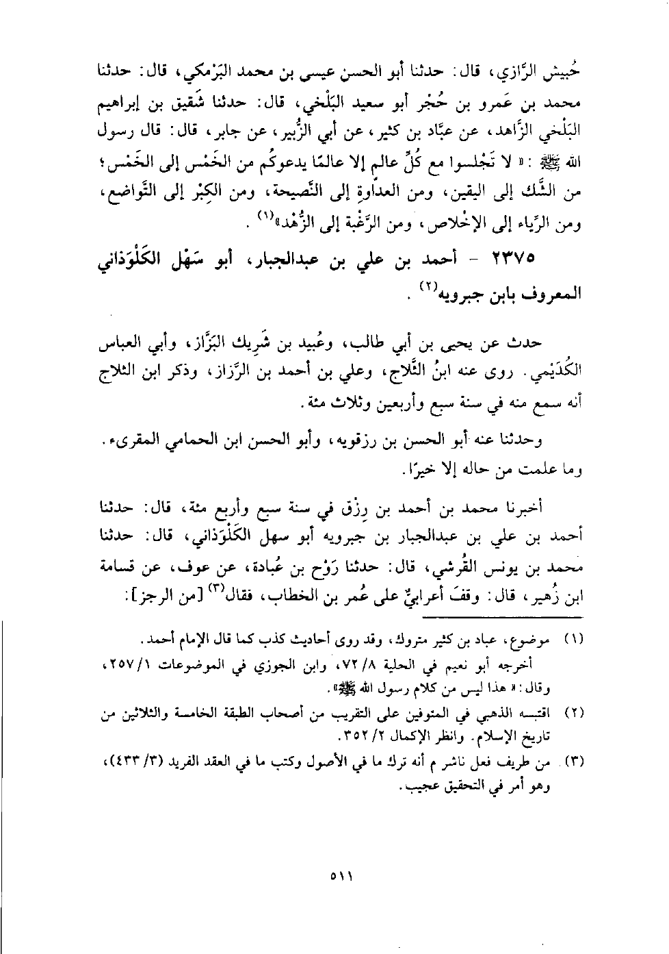 2375 - أَحْمَد بْن عَلِيّ بْن عَبْد الجبار أَبُو سهل الْكَلْوَذَانِيّ الْمَعْرُوف بابن جبرويه حدث عَنْ: يَحْيَى بْن أَبِي طالب، وعبيد بْن شريك البزاز، وأبي الْعَبَّاس الكديمي.