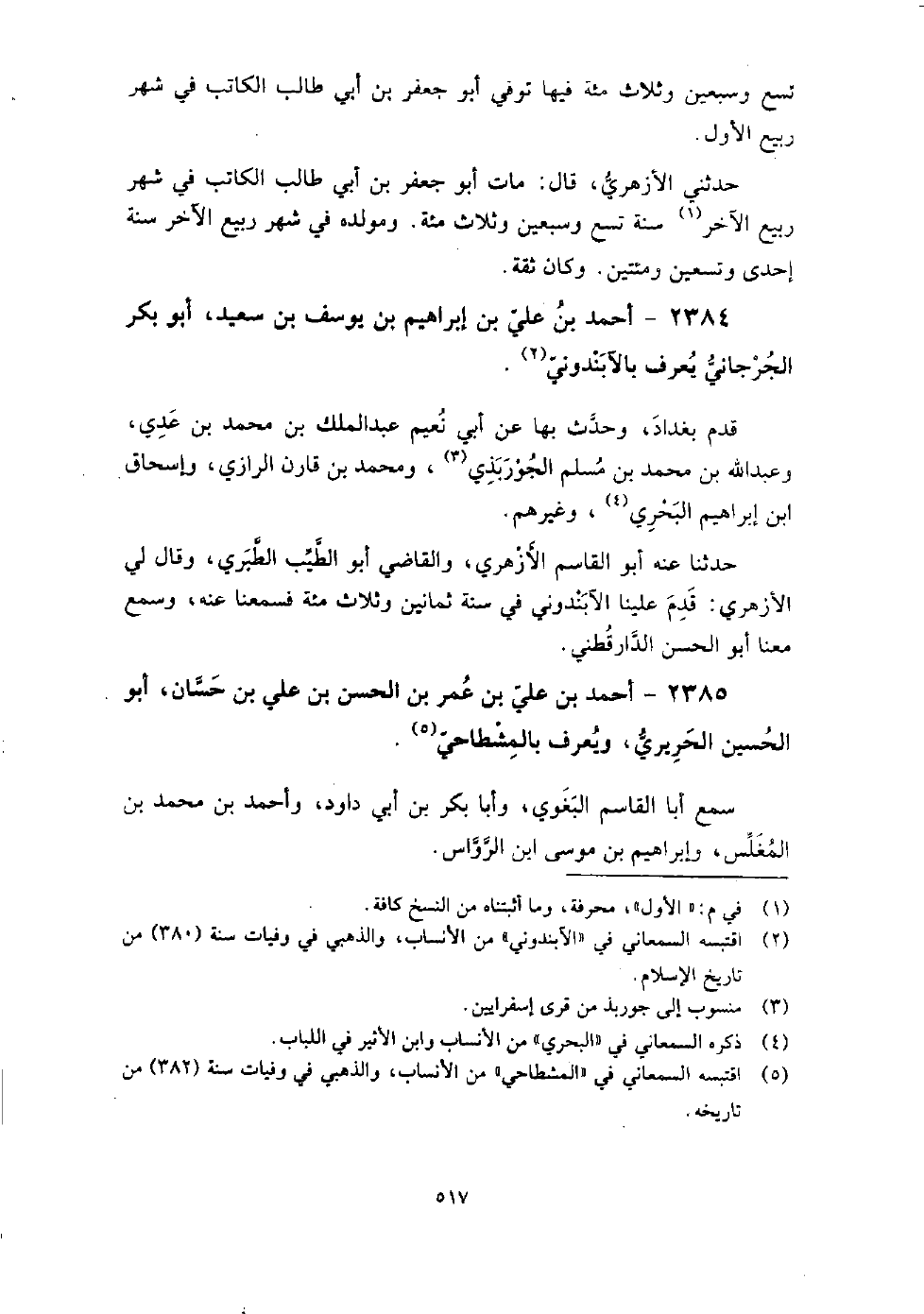 2385 - أَحْمَد بْن عَلِيّ بْن عُمَر الْحَسَن بْن عَلِيّ بْن حسان أَبُو الْحُسَيْن الحريري ويعرف بالمشطاحي سمع أَبَا الْقَاسِم البغوي، وَأَبَا بَكْر بْن أَبِي دَاوُد، وأحمد بْن مُحَمَّد بْن المغلس، وإبراهيم بْن مُوسَى بْن الرواس.