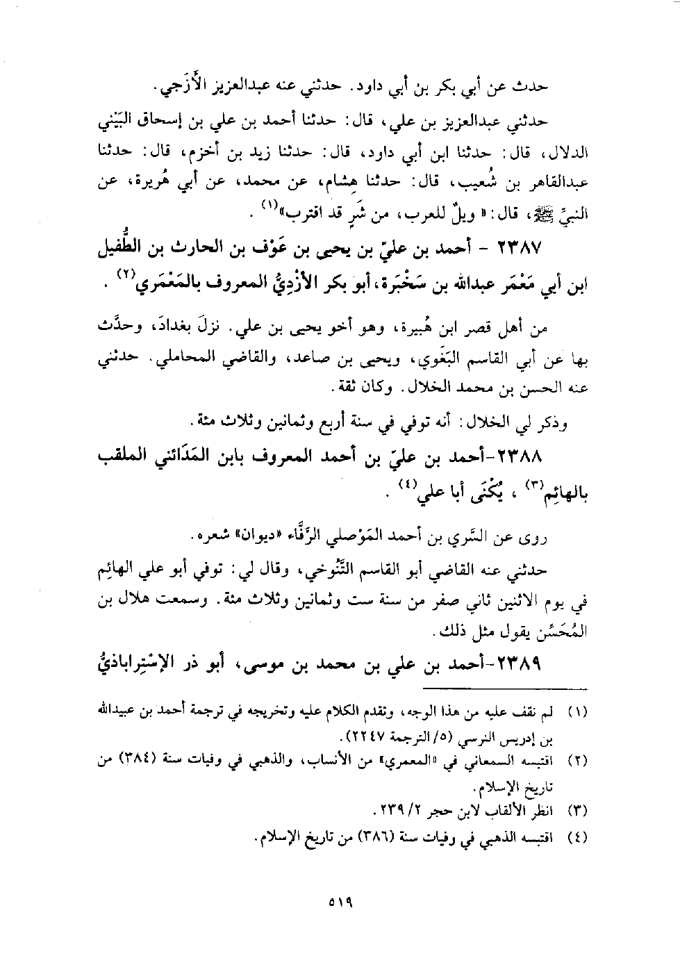 2387 - أَحْمَد بْن عَلِيّ بْن يَحْيَى بْن عوف بْن الحارث بْن الطفيل بْن أَبِي معمر عَبْد اللَّه بْن سخبرة أَبُو بَكْر الأزدي الْمَعْرُوف بالمعمري
