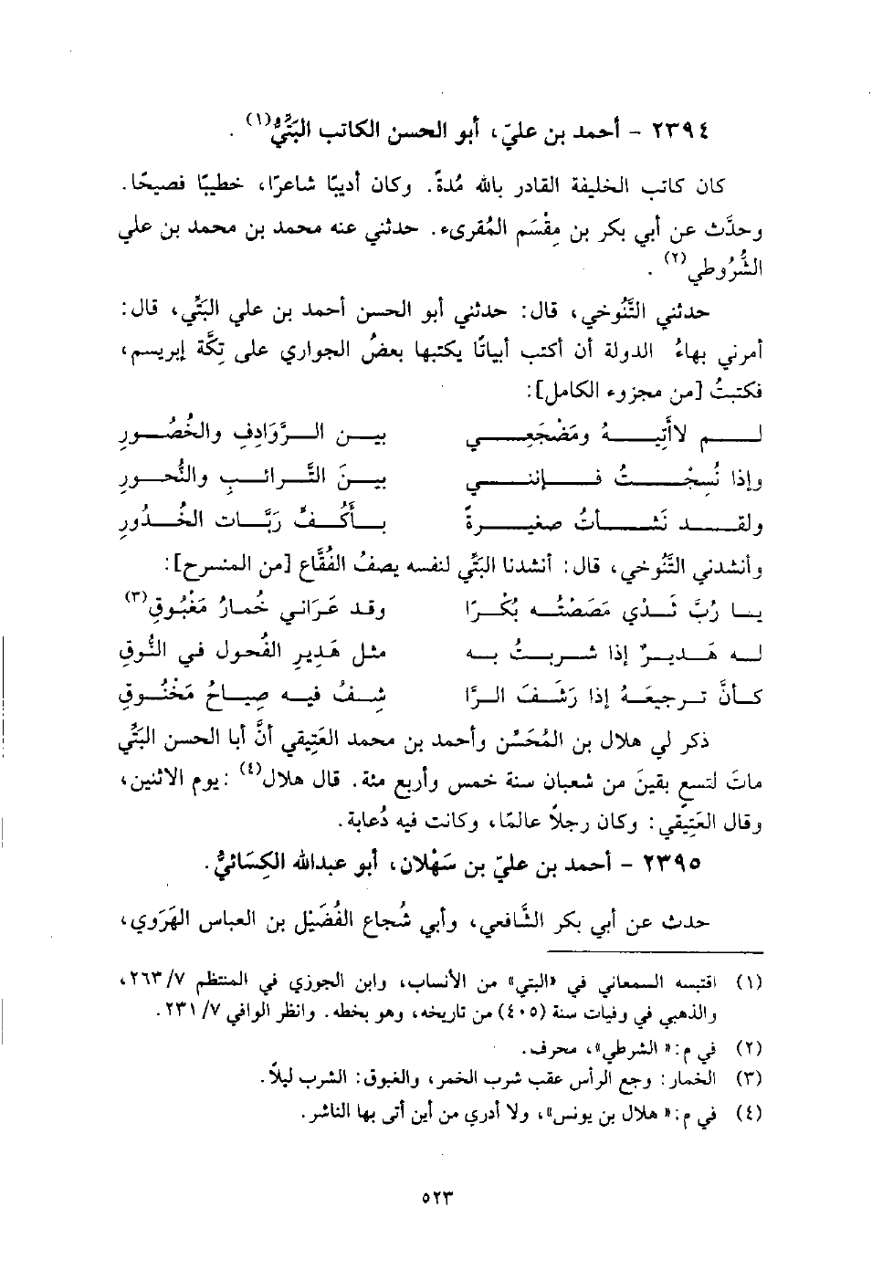 2394 - أَحْمَد بْن عَلِيّ أَبُو الْحَسَن الكاتب البتي كَانَ كاتب الخليفة القادر بالله مدة، وَكَانَ أديبا شاعرا، خطيبا فصيحا.