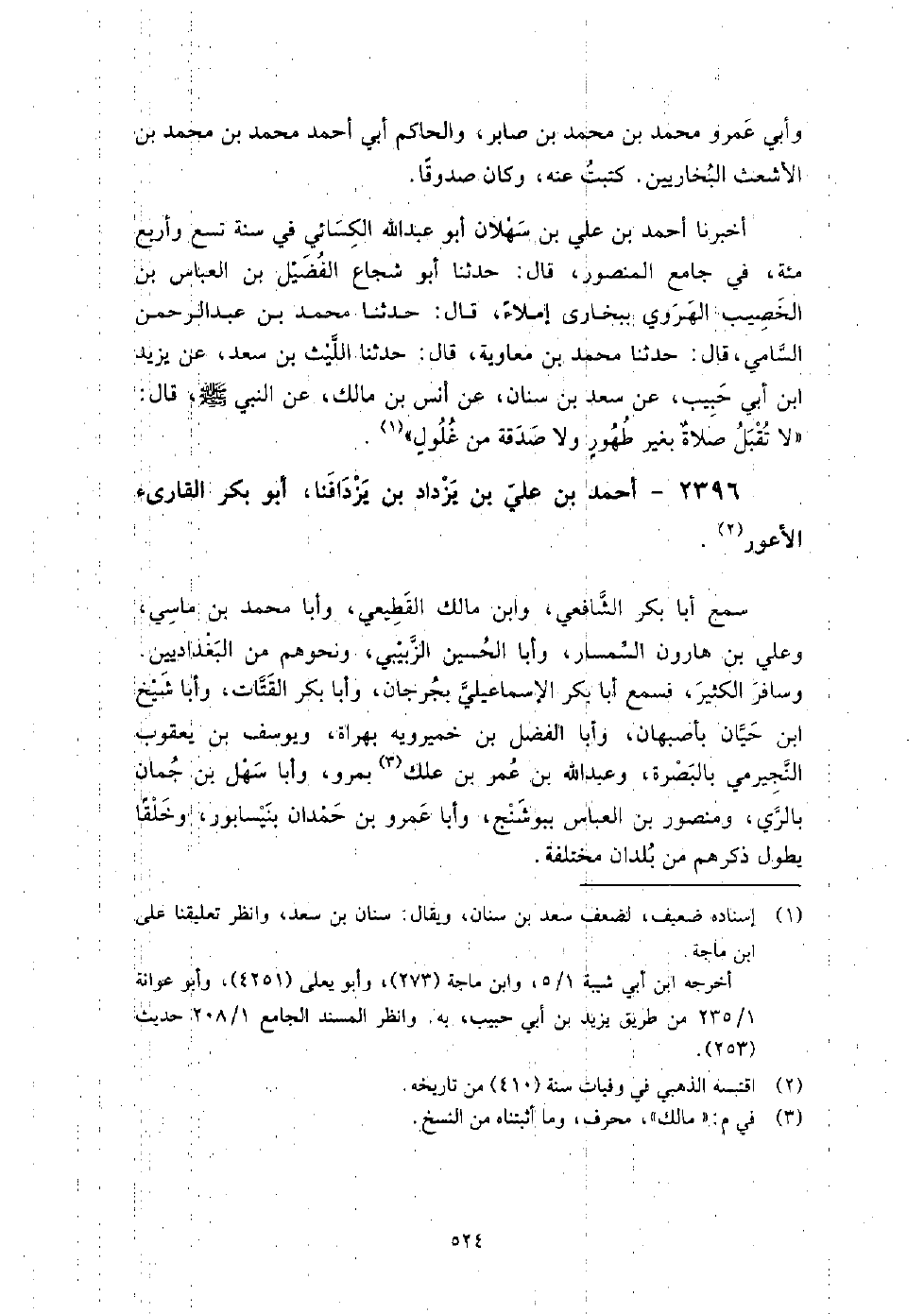 2396 - أَحْمَد بْن عَلِيّ بْن يزداد بْن يزدافنا أَبُو بَكْر القارئ الأعور سمع أَبَا بَكْر الشَّافِعِيّ، وابن مالك القطيعي، وَأَبَا مُحَمَّد بْن ماسي، وعلي بْن هارون السمسار، وَأَبَا الْحُسَيْن الزبيبي، ونحوهم من البغداديين.