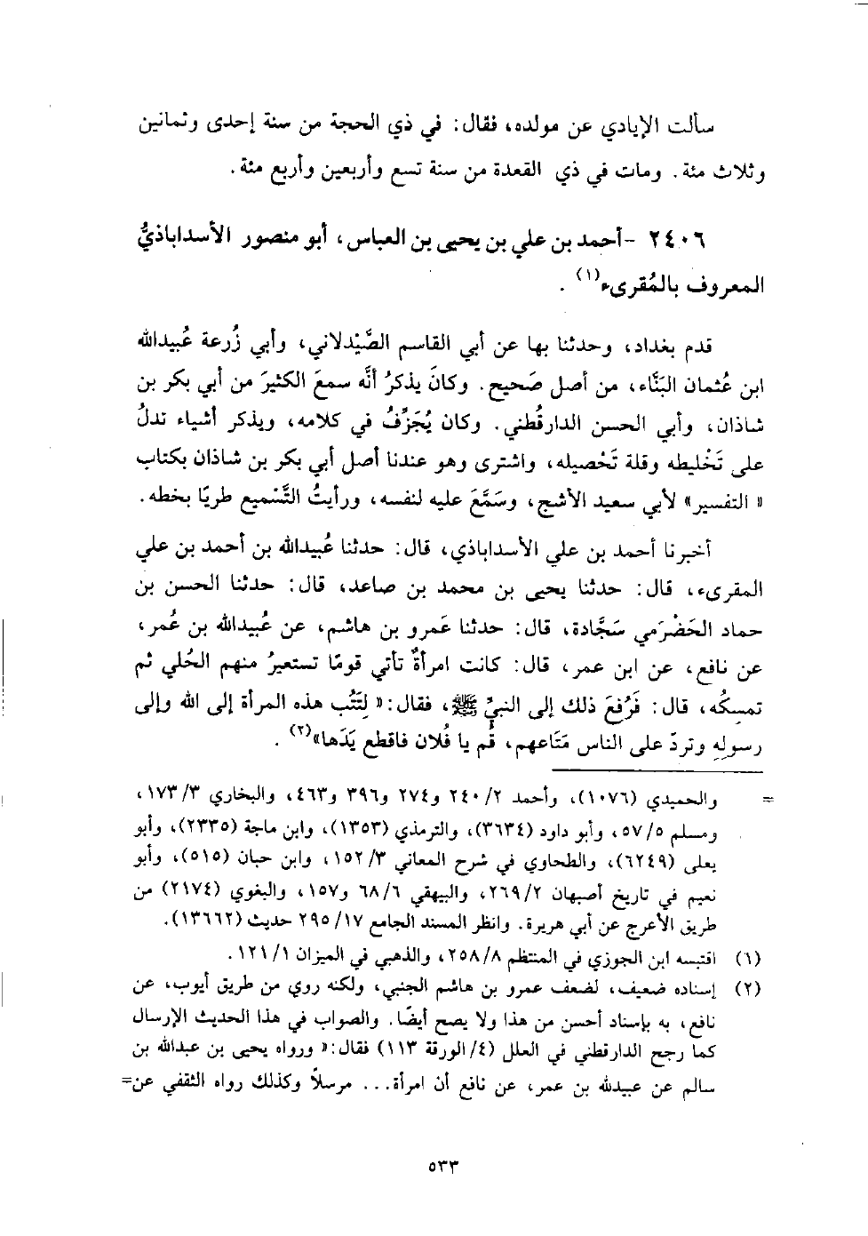 (1557) -[5: 533] أَخْبَرَنَا أَحْمَدُ بْنُ عَلِيٍّ الأَسْدَابَاذِيُّ، قَالَ: حَدَّثَنَا عُبَيْدُ اللَّهِ بْنُ أَحْمَدَ بْنِ عَلِيٍّ الْمُقْرِئُ، قَالَ: حَدَّثَنَا يَحْيَى بْنُ مُحَمَّدِ بْنِ صَاعِدٍ، قَالَ: حَدَّثَنَا الْحَسَنُ بْنُ حَمَّادٍ الْحَضْرَمِيُّ سَجَّادَةُ، قَالَ: حَدَّثَنَا عَمْرُو بْنُ هَاشِمٍ، عَنْ عُبَيْدِ اللَّهِ بْنِ عُمَرَ، عَنْ نَافِعٍ، عَنِ ابْنِ عُمَرَ، قَالَ: كَانَتِ امْرَأَةٌ تَأْتِي قَوْمًا تَسْتَعِيرُ مِنْهُمُ الْحُلِيَّ ثُمَّ تُمْسِكُهُ، قَالَ: فَرُفِعَ ذَلِكَ إِلَى النَّبِيِّ صَلَّى اللَّهُ عَلَيْهِ وَسَلَّمَ فَقَالَ: " لِتَتُبْ هَذِهِ الْمَرْأَةُ إِلَى اللَّهِ وَإِلَى رَسُولِهِ وَتَرُدَّ عَلَى النَّاسِ مَتَاعَهُمْ، قُمْ يَا فُلانُ فَاقْطَعْ يَدَهَا " سألت أَبَا مَنْصُور عَنْ مولده، فَقَالَ: ولدت بالكرخ فِي سنة ست وستين وثلاث مائة، وخرج من بغداد فِي سنة أربع وأربعين وأربع مائة، وبلغني أنه مات فِي سنة إحدى وستين وأربع مائة.