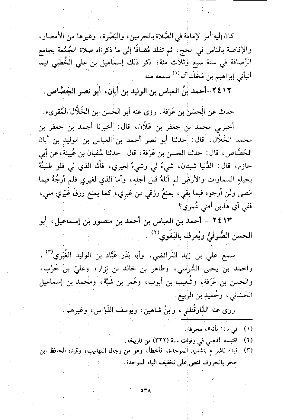 2413 - أَحْمَد بْن الْعَبَّاس بْن أَحْمَدَ بْن مَنْصُور بْن إِسْمَاعِيل أَبُو الْحَسَن الصوفي ويعرف بالبغوي سمع على بْن زَيْد الفرائضي، وَأَبَا بدر بْن عباد بْن الوليد الغبري، وأحمد بْن يَحْيَى السوسي، وطاهر بْن خَالِد بْن نزار، وعلي بْن حرب، والحسن بْن عرفة، وشعيب بْن أَيُّوب، وعمر بْن شبة، ومحمد بْن إِسْمَاعِيل الحساني، وحميد بْن الربيع.