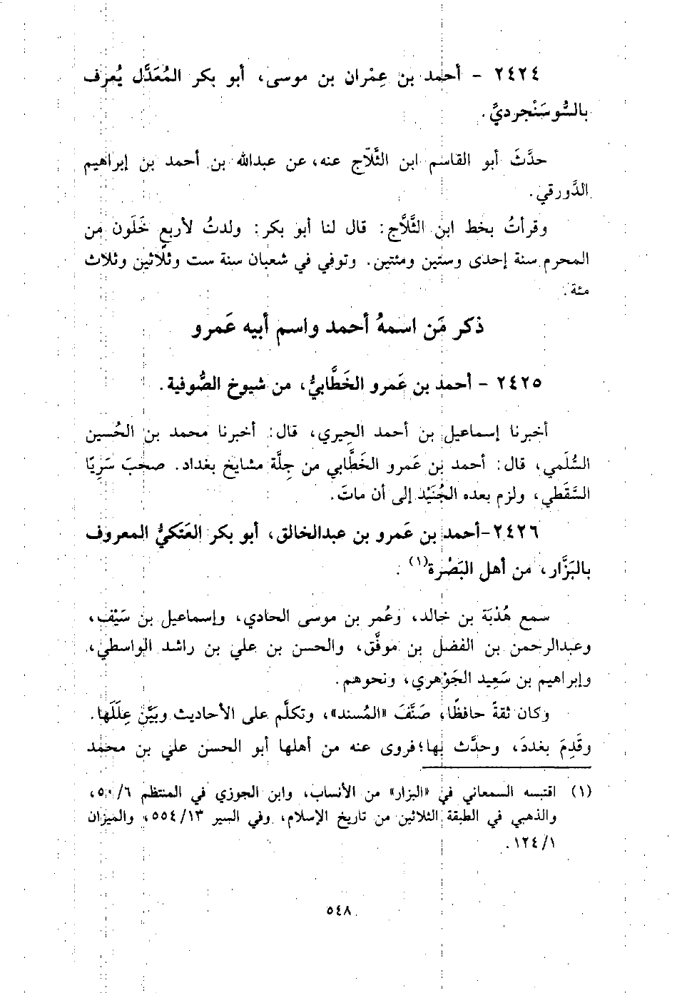 2424 - أَحْمَد بْن عمران بْن مُوسَى أَبُو بَكْر المعدل يعرف بالسوسنجردي حدث أَبُو الْقَاسِم ابْن الثلاج عَنْهُ، عَنْ عَبْد اللَّه بْن أَحْمَدَ بْن إِبْرَاهِيم الدورقي.