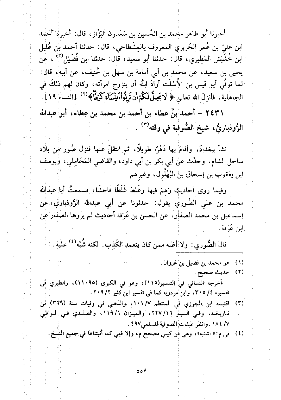 2431 - أَحْمَد بْن عطاء بْن أَحْمَدَ بْن مُحَمَّد بْن عطاء أَبُو عَبْد اللَّه الروذباري شيخ الصوفية فِي وقته نشأ بِبَغْدَادَ، وأقام بها دهرا طويلا، ثم انتقل عنها فنزل صور من بلاد ساحل الشام، وَحَدَّثَ عَنْ أَبِي بَكْر بْن أَبِي دَاوُد، والقاضي المحاملي، ويوسف بْن يَعْقُوب بْن إِسْحَاق بْن البهلول، وغيرهم.