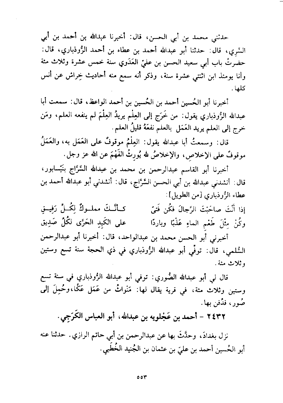 2432 - أَحْمَد بْن عجلويه بْن عَبْد اللَّه أَبُو الْعَبَّاس الكرجي نزل بغداد، وَحَدَّثَ بها عَنْ عَبْد الرَّحْمَن بْن أَبِي حاتم الرَّازِيّ، حَدَّثَنَا عَنْهُ أَبُو الْحُسَيْن أَحْمَد بْن عَلِيّ بْن عُثْمَان بْن الجنيد الخطبي.