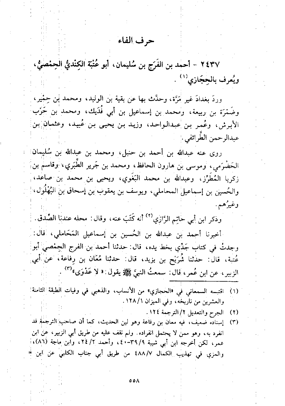 2437 - أَحْمَد بْن الفرج بْن سُلَيْمَان أَبُو عتبة الكندي الحمصي ويعرف بالحجازي ورد بغداد غير مرة، وَحَدَّثَ بها عَنْ بقية بْن الوليد، ومحمد بْن حمير، وضمرة بْن ربيعة، ومحمد بْن إِسْمَاعِيل بْن أَبِي فديك، ومحمد بْن حرب الأبرش، وعمر بْن عَبْد الْوَاحِدِ، وزيد بْن يَحْيَى بْن عبيد، وعثمان بْن عَبْد الرَّحْمَن الطرائفي.