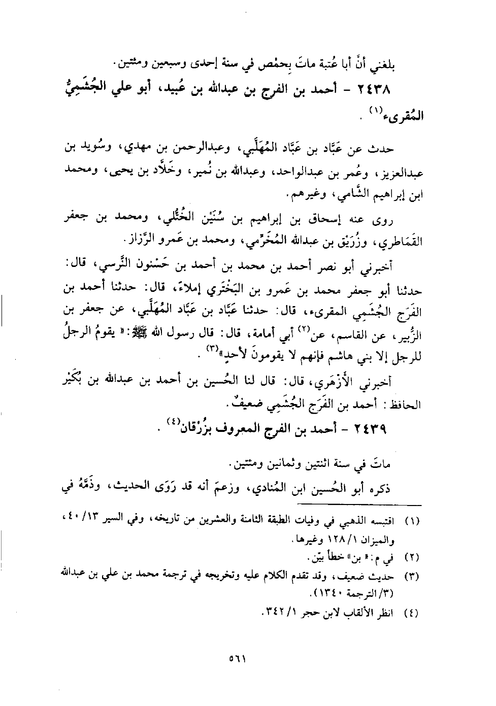 2439 - أَحْمَد بْن الفرج الْمَعْرُوف بزرقان مات فِي سنة اثنتين وثمانين ومائتين.