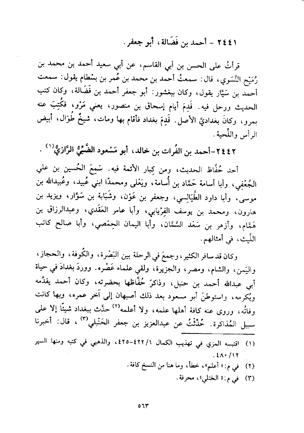 2442 - أَحْمَد بْن الفرات بْن خَالِد أَبُو مسعود الضبي الرَّازِيّ أحد حفاظ الحديث، ومن كبار الأئمة فيه.