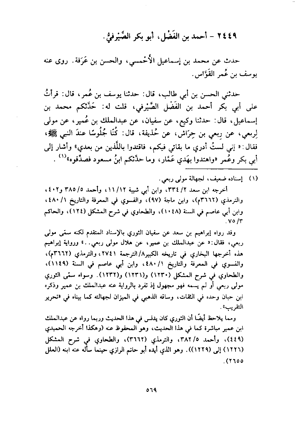 (1581) -[5: 569] حَدَّثَنِي الْحَسَنُ بْنُ أَبِي طَالِبٍ، قَالَ: حَدَّثَنَا يُوسُفُ بْن عُمَرَ، قَالَ: قَرَأْتُ عَلَى أَبِي بَكْرٍ أَحْمَدَ بْنِ الْفَضْلِ الصَّيْرَفِيِّ، قُلْتُ لَهُ: حَدَّثَكُمْ مُحَمَّدُ بْنُ إِسْمَاعِيلَ، قَالَ: حَدَّثَنَا وَكِيعٌ، عَنْ سُفْيَانَ، عَنْ عَبْدِ الْمَلِكِ بْنِ عُمَيْرٍ، عَنْ مَوْلًى لِرِبْعِيِّ بْنِ حِرََاشٍ، عَنْ رِبْعِيِّ بْنِ حِرَاشٍ، عَنْ حُذَيْفَةَ، قَالَ: كُنَّا جُلُوسًا عِنْدَ النَّبِيِّ صَلَّى اللَّهُ عَلَيْهِ وَسَلَّمَ فَقَالَ: " إِنِّي لَسْتُ أَدْرِي مَا بَقَائِي فِيكُمْ، فَاقْتَدُوا بِالَّذِينَ مِنْ بَعْدِي "، وَأَشَارَ إِلَى أَبِي بَكْرٍ، وَعُمَرَ، " وَاهْتَدُوا بِهَدْيِ عَمَّارٍ، وَمَا حَدَّثَكُمُ ابْنُ مَسْعُودٍ فَصَدِّقُوهُ "