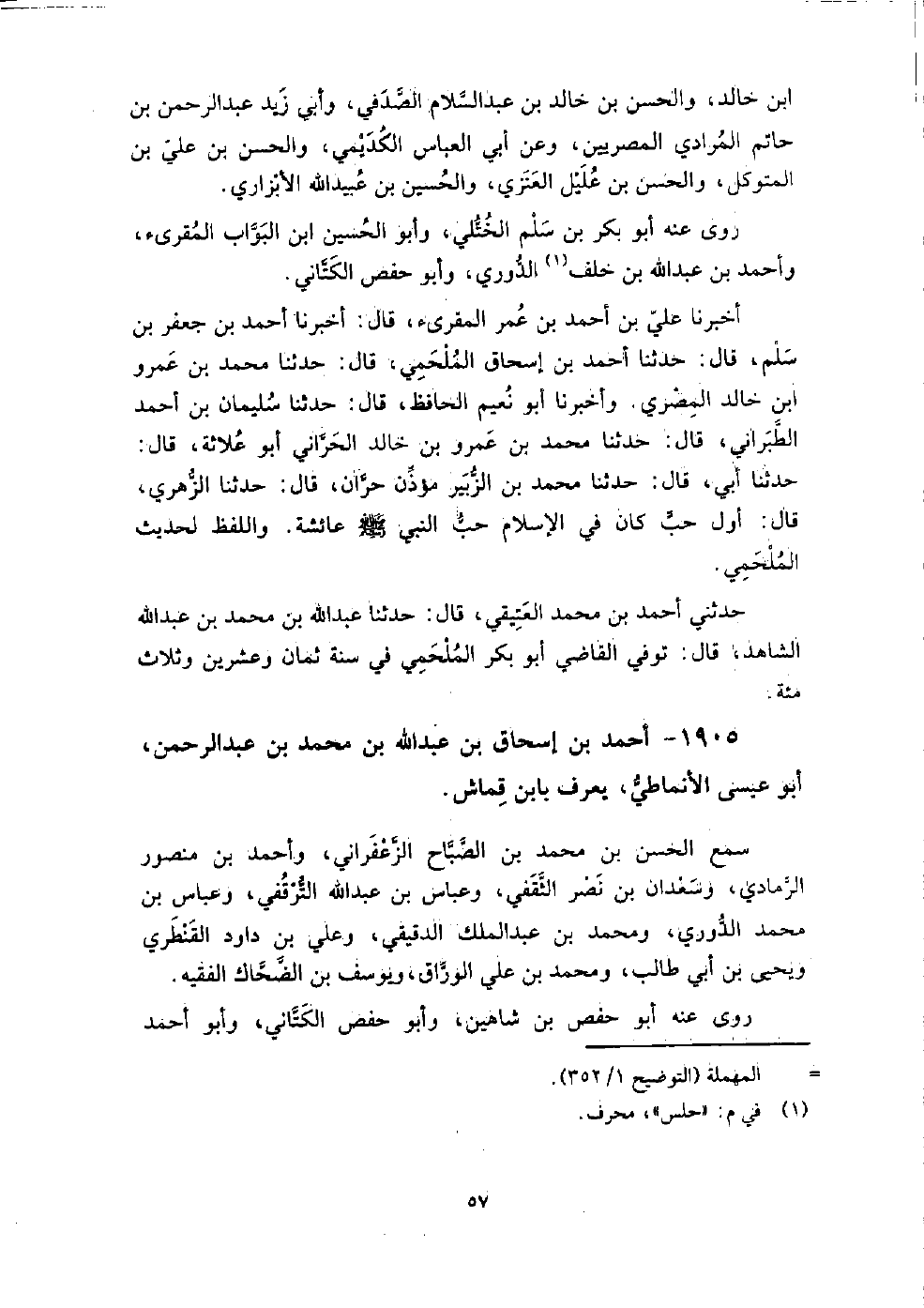 1905 - أَحْمَد بْن إِسْحَاق بْن عَبْد اللَّه بْن مُحَمَّد بْن عَبْد الرَّحْمَن أَبُو عِيسَى الأنماطي يعرف بابن قماش سمع الْحَسَن بْن مُحَمَّد بْن الصباح الزعفراني، وأحمد بْن مَنْصُور الرمادي، وسعدان بْن نصر الثقفي، وعباس بْن عَبْد اللَّه الترقفي، وعباس بْن مُحَمَّد الدوري، ومحمد بْن عَبْد الملك الدقيقي، وعلي بْن دَاوُد القنطري، ويحيى بْن أَبِي طالب، ومحمد بْن عَلِيّ الوراق، ويوسف بْن الضحاك الْفَقِيه.