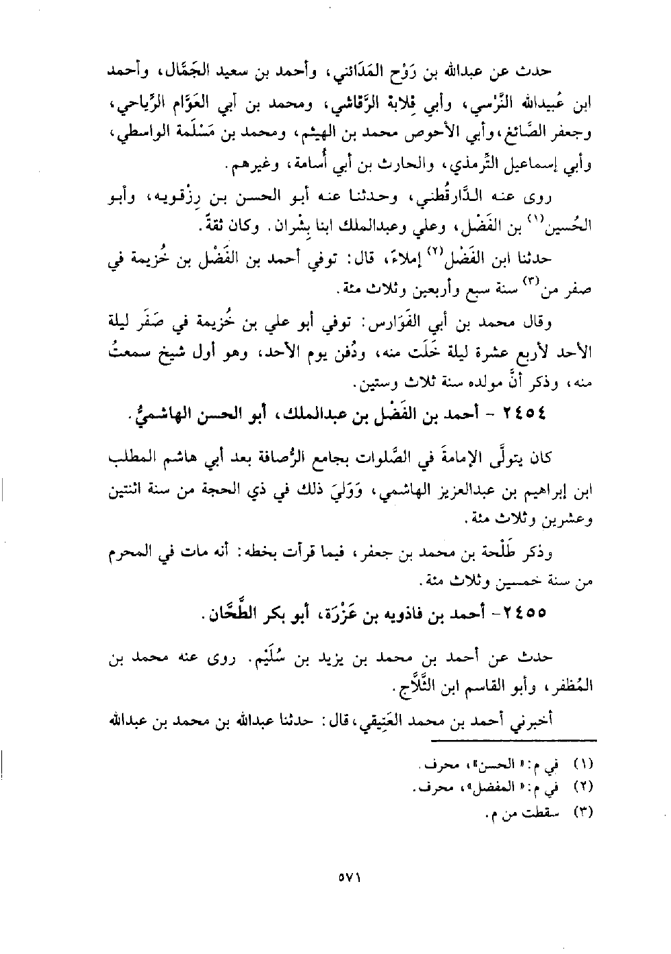 2454 - أَحْمَد بْن الْفَضْل بْن عَبْد الملك أَبُو الْحَسَن الهاشمي كَانَ يتولى الإمامة فِي الصلوات بجامع الرصافة بعد أَبِي هاشم المطلب بْن إِبْرَاهِيم بْن عَبْد العزيز الهاشمي، وولى ذلك فِي ذي الحجة من سنة اثنتين وعشرين وثلاث مائة.