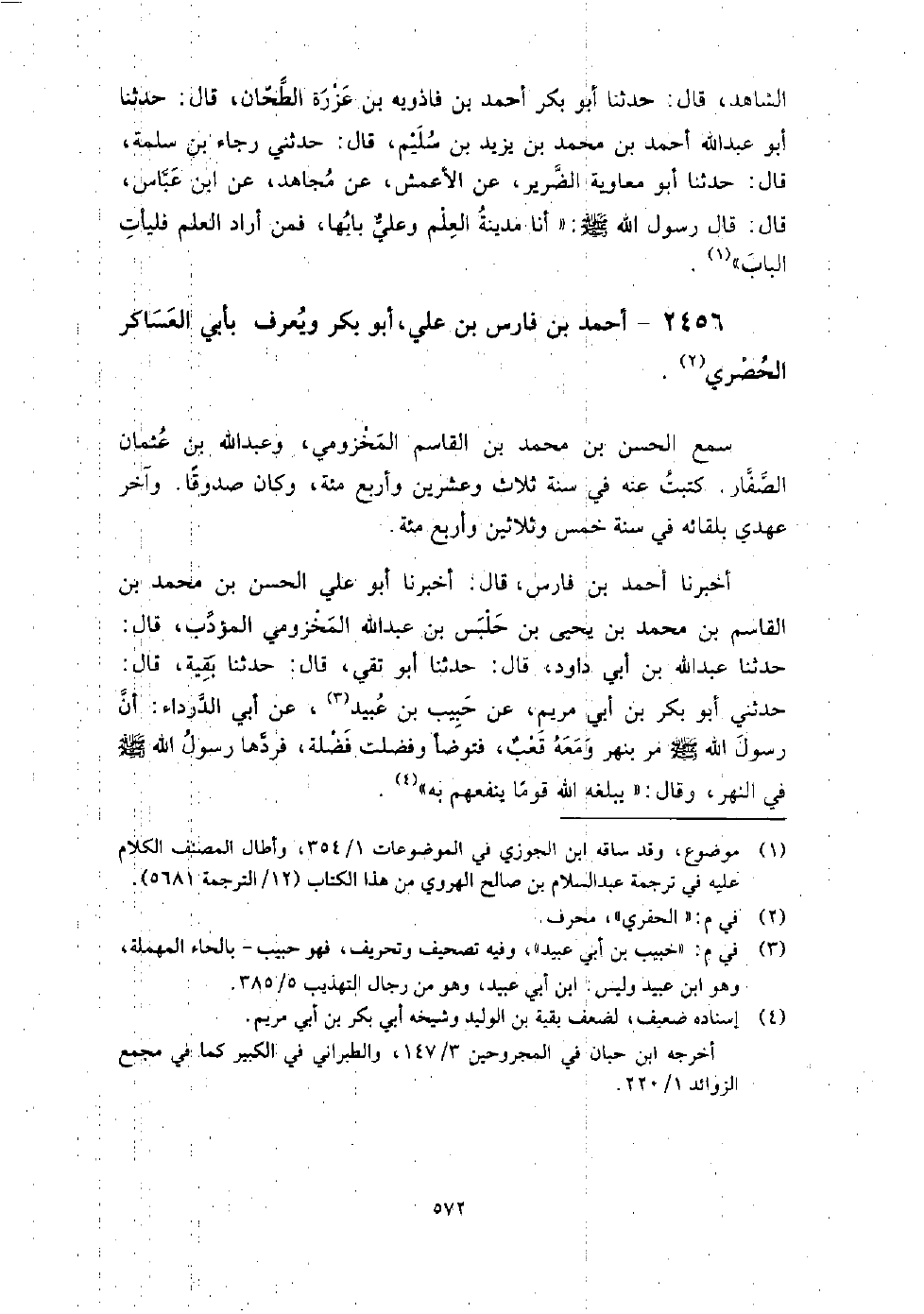 2456 - أَحْمَد بْن فارس بْن عَلِيّ أَبُو بَكْر ويعرف بأبي العساكر الحصري سمع الْحَسَن بْن مُحَمَّد بْن الْقَاسِم المخزومي، وَعَبْد اللَّهِ بْن عُثْمَان الصفار.
