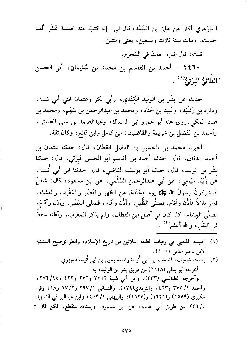 2460 - أَحْمَد بْن الْقَاسِم بْن مُحَمَّد بْن سُلَيْمَان أَبُو الْحَسَن الطائي البرتي حدث عَنْ: بشر بْن الوليد الكندي، وأبي بَكْر، وعثمان ابني أَبِي شيبة، وداود بْن رشيد، وعبيد بْن جناد، ومحمد بْن عَبْد الرَّحْمَن بْن سهم، ومحمد بْن عباد المكي.