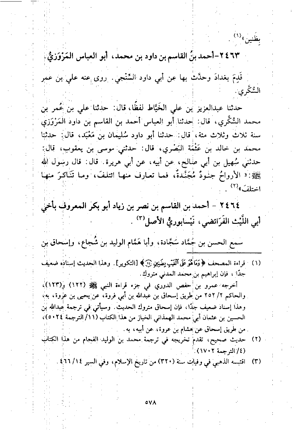 2463 - أَحْمَد بْن الْقَاسِم بْن دَاوُد بْن مُحَمَّد أَبُو الْعَبَّاس المروزي قدم بغداد، وَحَدَّثَ بها عَنْ أَبِي دَاوُد السنجي.
