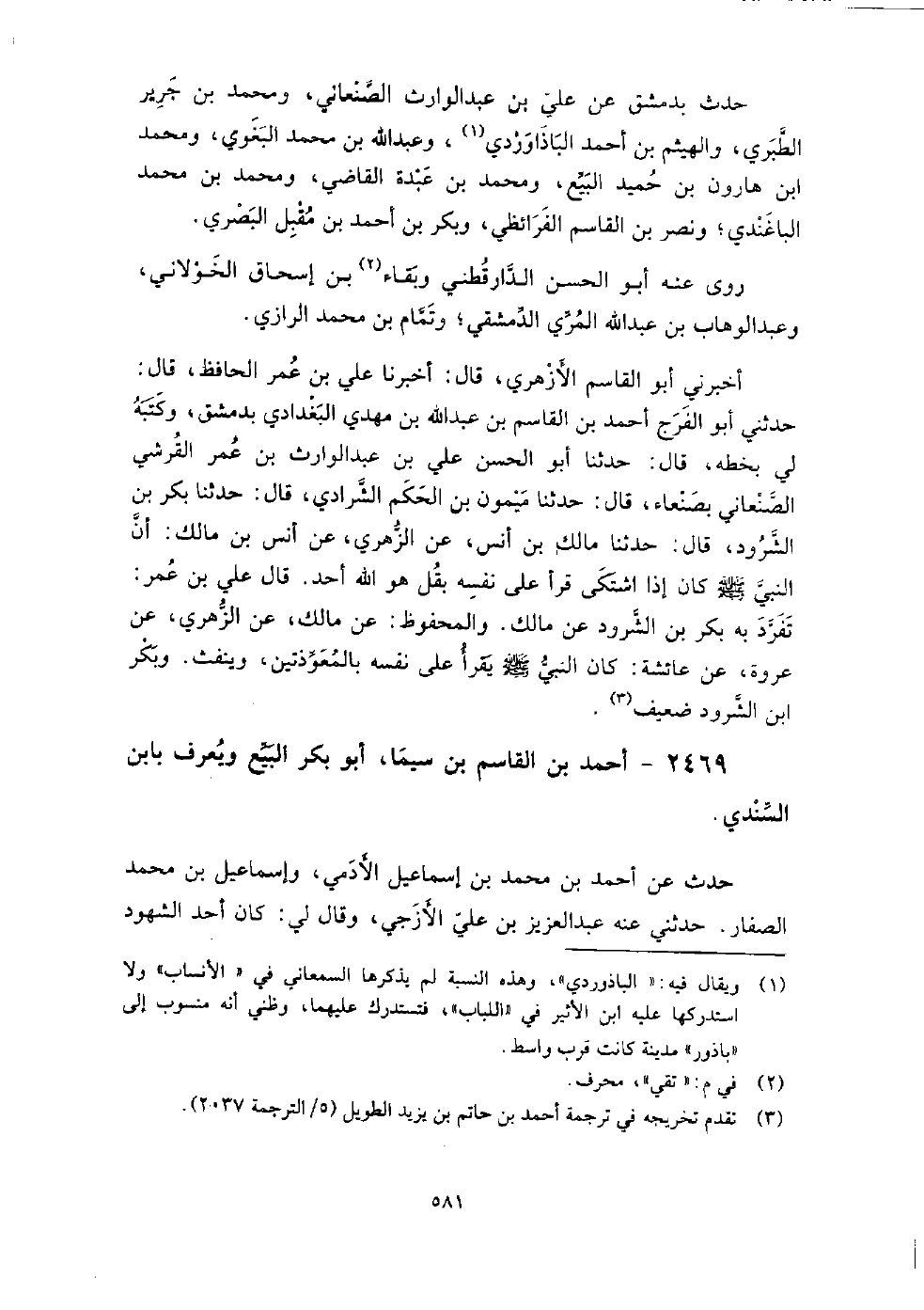 2469 - أَحْمَد بْن الْقَاسِم بْن سيما أَبُو بَكْر البيع ويعرف بابن السندي حدث عَنْ: أَحْمَد بْن مُحَمَّد بْن إِسْمَاعِيل الأدمي، وإسماعيل بْن مُحَمَّد الصفار.