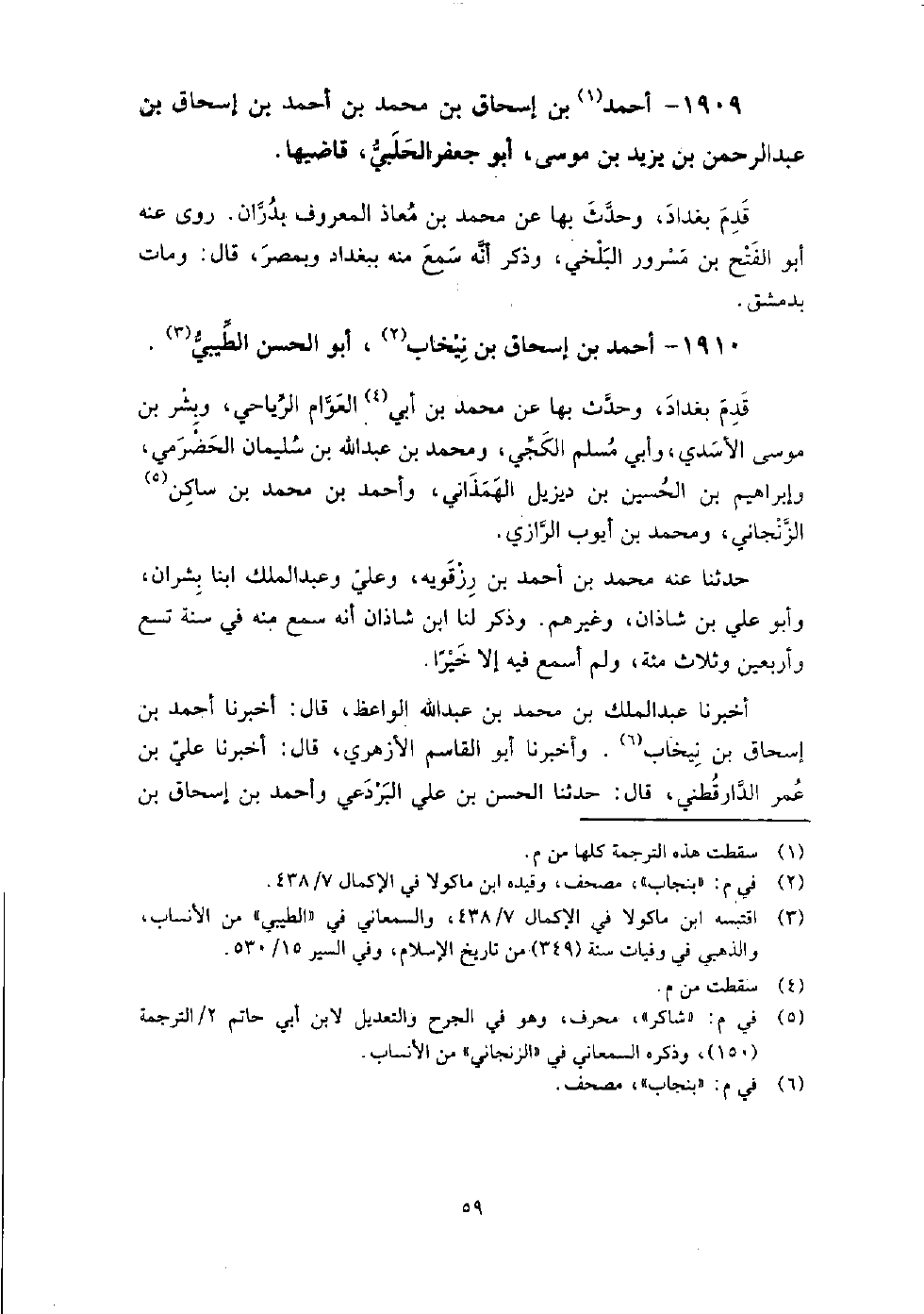 1910 - أَحْمَد بْن إِسْحَاق بْن نِيخاب أَبُو الْحَسَن الطيبي قدم بغداد، وَحَدَّثَ بها عَنْ مُحَمَّد بْن أبي العوام الرياحي، وبشر بْن مُوسَى الأسدي، وأبي مُسْلِم الكجي، ومحمد بْن عَبْد اللَّه بْن سُلَيْمَان الحضرمي، وإبراهيم بْن الْحُسَيْن بْن ديزيل الهمذاني، وأحمد بْن مُحَمَّد بْن ساكن الزنجاني، ومحمد بْن أَيُّوب الرَّازِيّ.