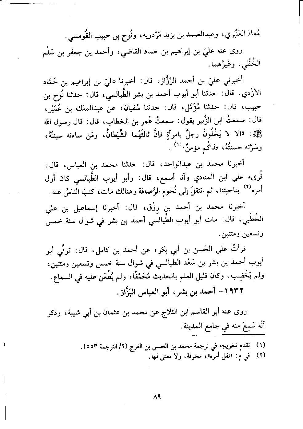 1932 - أَحْمَد بْن بشر أَبُو الْعَبَّاس البزاز رَوَى عَنْهُ: أَبُو الْقَاسِم ابْن الثلاج، عَنْ مُحَمَّد بْن عُثْمَان بْن أَبِي شيبة، وذكر أنه سمع منه فِي جامع المدينة.