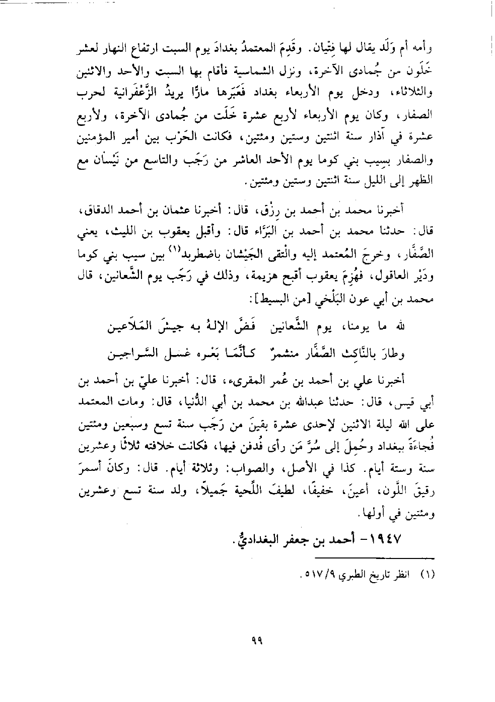1947 - أَحْمَد بْن جعفر البغدادي ذكره عَبْد الرَّحْمَن بْن أَبِي حاتم، وَقَالَ: قدم الري، فروى عَنْ سُريج بْن يونس ونحوه، رَوَى عَنْهُ: الْفَضْل بْن شَاذَانَ الْمُقْرِئ، ووثقه سَمِعْتُ الْفَضْل، يَقُولُ: هو ثقة صدوق.