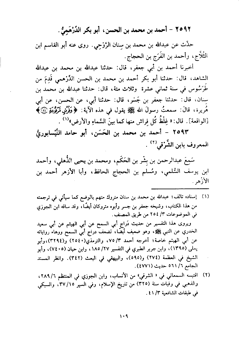 2593 - أَحْمَد بْن مُحَمَّد بْن الحسن أَبُو حامد النيسابوري المعروف بابن الشرقي سمع عَبْد الرحمن بْن بشر بْن الحكم، ومحمد بْن يحيى الذهلي، وأَحْمَد بْن يوسف السلمي، ومسلم بْن الحجاج الحافظ، وأبا الأزهر أَحْمَد بْن الأزهر.