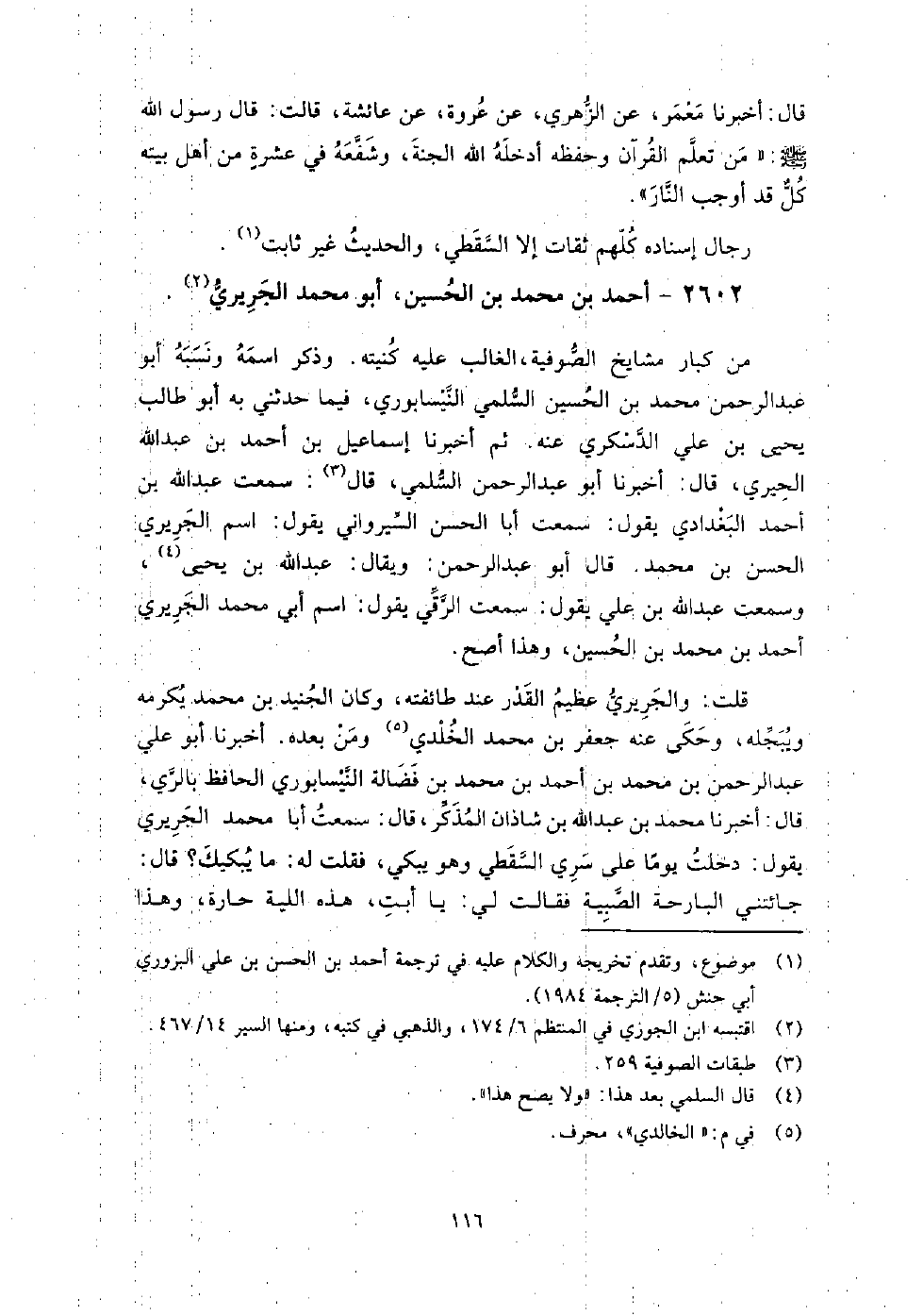 2602 - أَحْمَد بْن مُحَمَّد بْن الحسين أَبُو مُحَمَّد الجريري من كبار مشايخ الصوفِية، الغالب عَلَيْهِ كنيته، وذكر اسمه ونسبه أَبُو عَبْد الرحمن مُحَمَّد بْن الحسين السلمي النيسابوري، فِيما حَدَّثَنِي بِهِ أَبُو طالب يحيى بْن علي الدسكري عنه، ثم أَخْبَرَنَا إسماعيل بْن أَحْمَد بْن عَبْد اللَّه الحيري، قَالَ: أَخْبَرَنَا أَبُو عَبْد الرحمن السلمي، قَالَ: سمعت عَبْد اللَّه بْن أَحْمَد البغدادي، يقول: سمعت أبا الحسن السيرواني، يقول: اسم الجريري الحسن بْن مُحَمَّد، قَالَ أَبُو عَبْد الرحمن: ويقال عَبْد اللَّه بْن يحيى، وسمعت عَبْد اللَّه بْن علي، يقول: سمعت الرقي يقول: اسم أَبِي مُحَمَّد الجريري أَحْمَد بْن مُحَمَّد بْن الحسين، وهذا أصح.