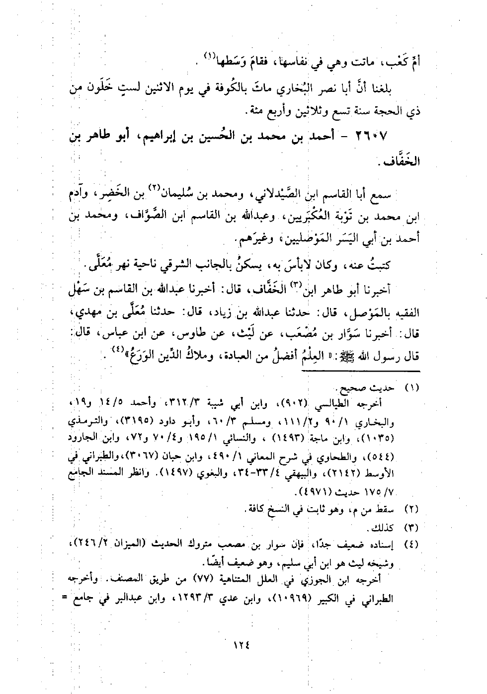 2607 - أَحْمَد بْن مُحَمَّد بْن الحسين بْن إِبْرَاهِيم أَبُو طاهر بْن الخفاف سمع أبا القاسم ابْن الصيدلاني، ومحمد بْن سليمان بن الخضر، وآدم بْن مُحَمَّد بْن توبة العكبريين، وعبد اللَّه بْن القاسم ابن الصواف، ومحمد بْن أَحْمَد بْن أَبِي اليسر الموصليين، وغيرهم.