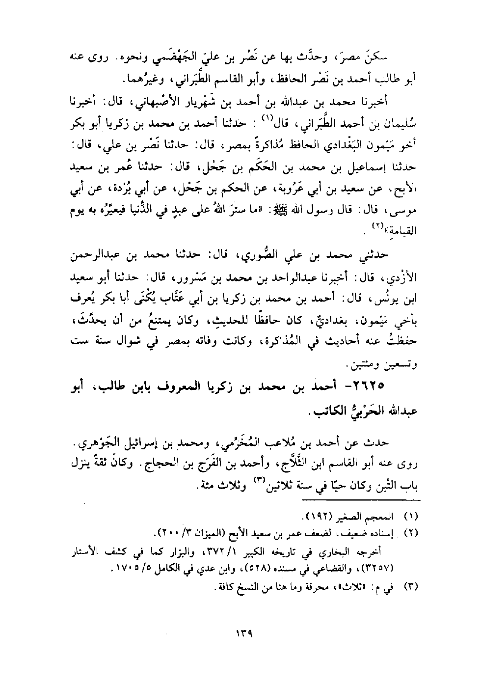 2625 - أَحْمَد بْن مُحَمَّد بْن زكريا المعروف بابن طالب أَبُو عَبْد اللَّه الحربي الكاتب حدث عَن أَحْمَد بْن ملاعب المخرمي، ومحمد بْن إسرائيل الجوهري.