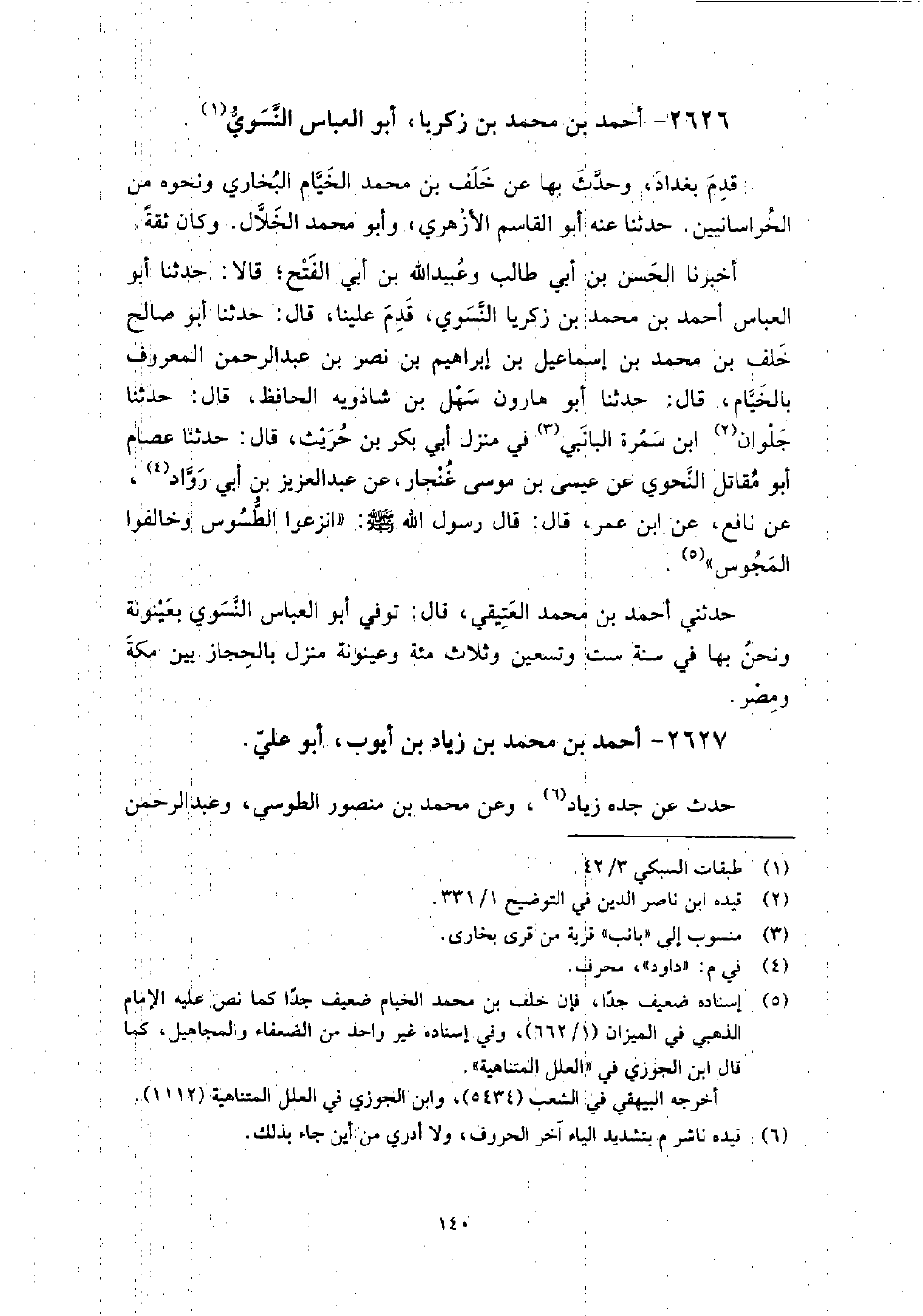 2626 - أَحْمَد بْن مُحَمَّد بْن زكريا أَبُو العباس النسوي قدم بغداد، وحدث بها عَن خلف بْن مُحَمَّد الخيام البخاري، ونحوه من الخراسانيين.