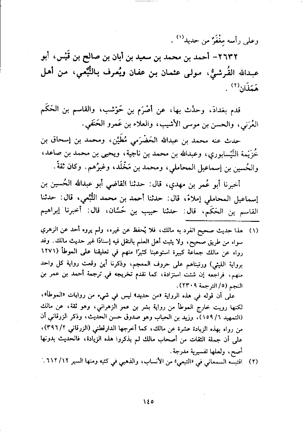 2632 - أَحْمَد بْن مُحَمَّد بْن سعيد بْن أبان بْن صالح بْن قيس أَبُو عَبْد اللَّه القرشي مولى عثمان بْن عفان ويعرف بالتبعي من أهل همذان قدم بغداد، وحدث بها، عَن أصرم بْن حوشب، وَالقاسم بْن الحكم العرني، وَالحسن بْن موسى الأشيب، وَالعلاء بْن عمرو الحنفِي.