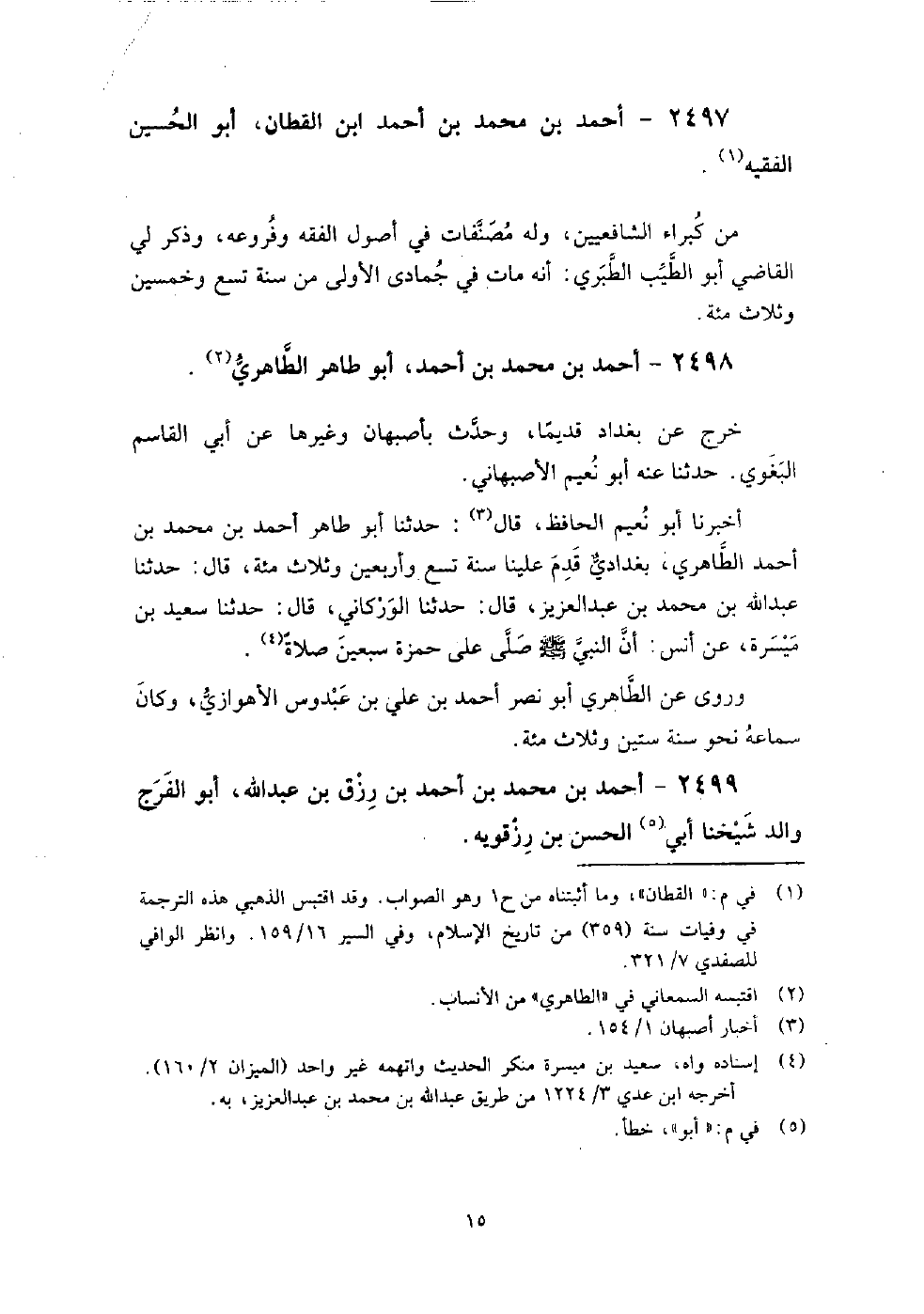 2497 - أَحْمَد بْن مُحَمَّد بْن أَحْمَد بْن القطان أَبُو الحسين الفقيه من كبراء الشافعيين، وله مصنفات في أصول الفقه وفروعه، وذكر لي القاضي أَبُو الطيب الطبري: " أنه مات في جمادى الأولى من سنة تسع وخمسين وثلاث مائة ".